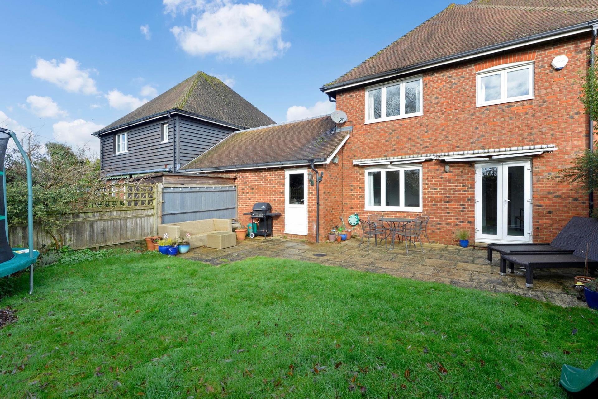 The first floor comprises an impressive primary bedroom with two sets of built-in cupboards and a large ensuite bathroom with bath and separate shower with Aqualisa thermostatic shower. This bedroom has lovely views over the rear meadow and towards the South Downs beyond. There are two further good-sized bedrooms and a family bathroom, also with Aqualisa thermostatic shower over bath. The spacious landing has loft access via a loft ladder. The outside space is equally impressive, with a private rear garden that is perfect for relaxing, entertaining, or enjoying al fresco dining. The garden is mainly laid to lawn with a good-sized patio area with ample space for outdoor seating, offering a safe and secure environment for children and pets to play. Mature planting and fencing provide excellent privacy, while the garden’s south-facing orientation ensures plenty of sunshine throughout the day. The front of the house features driveway parking and a further parking spot providing parking in total for two cars, in addition to the garage. With its combination of peaceful surroundings, stunning views, and practical outdoor features, this property is an ideal retreat for those seeking both comfort and convenience in a prime location.
