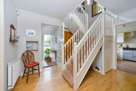 A spacious and extended four bedroom semi detached home situated on a large garden plot within a residential road, close to the village centre. The property has accommodation arranged over two floors with an enclosed entrance porch leading to an inner hallway with cloakroom off, study having fitted desk and bookshelves, fitted kitchen/breakfast room, a dining room and family room with open fireplace, steps down to a good size lounge with double doors to the rear overlooking the garden. Stairs rise to the first floor where there are four bedrooms with bedrooms one, two and three having fitted wardrobe cupboards and the first floor is completed by a spacious family bathroom with separate bath and shower. Outside, the property is approached via a brick paved driveway providing parking for several cars, side access to the rear garden, which is a lovely feature of the property being of good size having a covered veranda area off the kitchen/breakfast room stepping down to a beautifully landscaped garden with well stocked raised flowerbeds interspersed by lawns with paved patio around, and a timber summer house. At the foot of the garden, the property extends into woodland. We highly recommend a visit to fully appreciate the space that this property offers complemented by its good size garden and convenience to local amenities and countryside walks. There is planning permission granted to extend the downstairs cloakroom.
