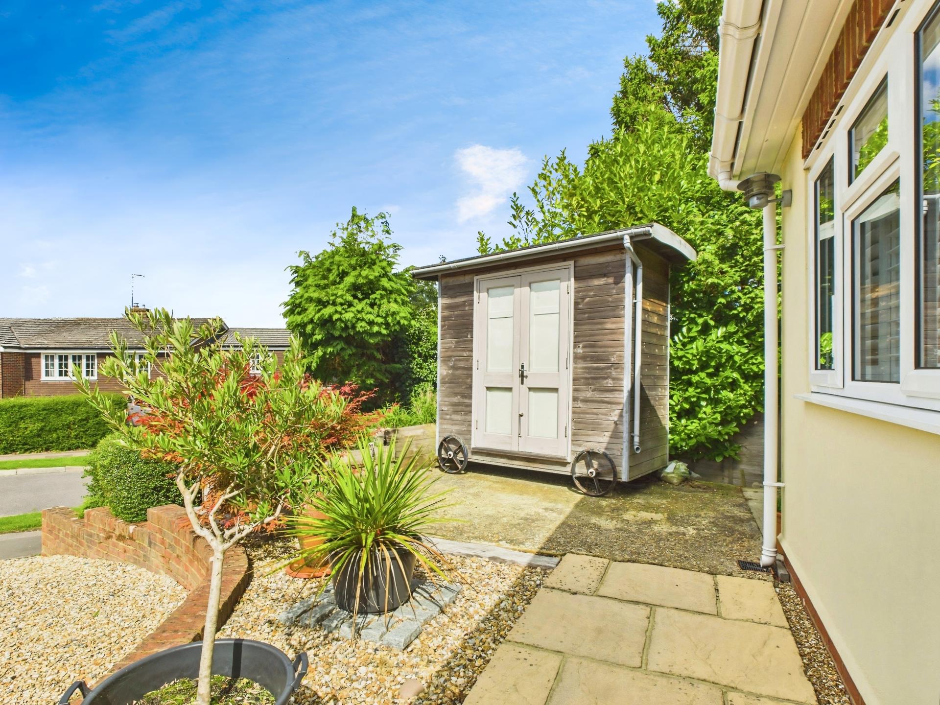 PARKING & GARDENS  The property is set on a good-sized, secluded plot, with a gravel driveway to the front of the property providing driveway parking for multiple vehicles, with a raised brick retaining wall, mature flower beds and hedging. There is dual side access, with concealed storage to the Northern side and a gated storage area to the Southern side. Both sides lead into an attractive secluded rear garden, that has a sheltered patio area set adjacent to the side of the conservatory and further patio area with steps rising to an area of lawn, with mature flower and shrub borders, fencing and hedging. The garden also features a timber outbuilding, currently used for storage, that could be adapted to create a home office or gym.