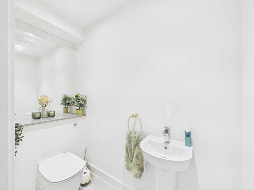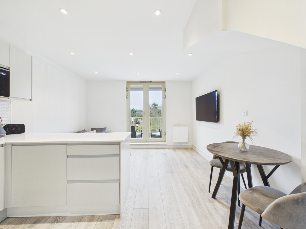 PROPERTY - The front door opens into a spacious entrance hall, accessed via the beautifully maintained communal hallway of the apartment building. From the hall you will find a convenient storage cupboard to the right, doors then lead to all ground-floor rooms, including a handy downstairs WC and the impressive 15'8" x 12'2" open-plan living kitchen dining area. This bright and inviting space is a standout feature of the home, with large patio doors opening onto the private south-facing balcony, flooding the room with natural light. There is ample space for both a comfortable seating area and a dining table, while the contemporary kitchen is fitted with a stylish range of floor and wall-mounted units, cleverly concealing a number of integrated appliances. Upstairs on the first floor, Bedroom One is generously proportioned and again filled with natural light, further enhanced by large built-in wardrobes. The family bathroom is also located on this floor and is finished to a modern standard, featuring a spacious walk-in shower. In addition, there is a substantial storage area hidden under the stairs to bedroom 2, ideal for use as a loft-style storage space, offering excellent capacity despite restricted head height. On the second floor, you will find Bedroom Two, another well-sized double room with plenty of space for a desk and dressing table, or alternatively additional wardrobe storage.