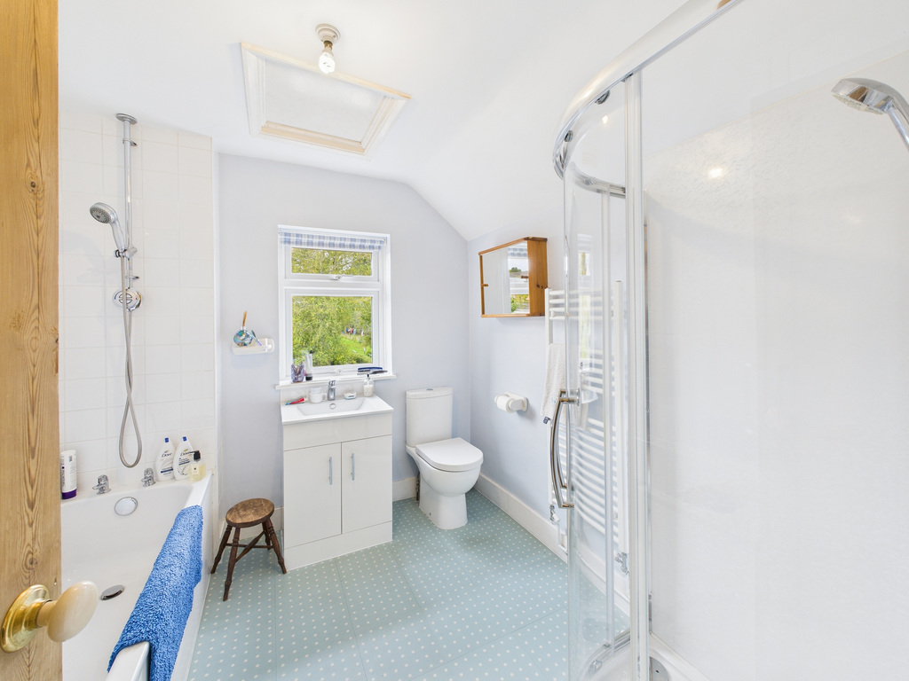 The property features spacious accommodation arranged across three floors. The ground floor offers a cosy sitting room, with a feature open fireplace, a separate dining room boasting a log burner, and a generously proportioned fitted kitchen providing extensive storage, work surfaces and space for appliances. The first floor includes a master bedroom enjoying attractive views towards open fields, with ample space for a wardrobe and dressing table, a further bedroom overlooking the rear garden and a modern white bathroom suite incorporating both a bath and separate shower cubicle. The second floor offers a double bedroom, with far-reaching views across open fields, and an en suite WC complete with wash hand basin.