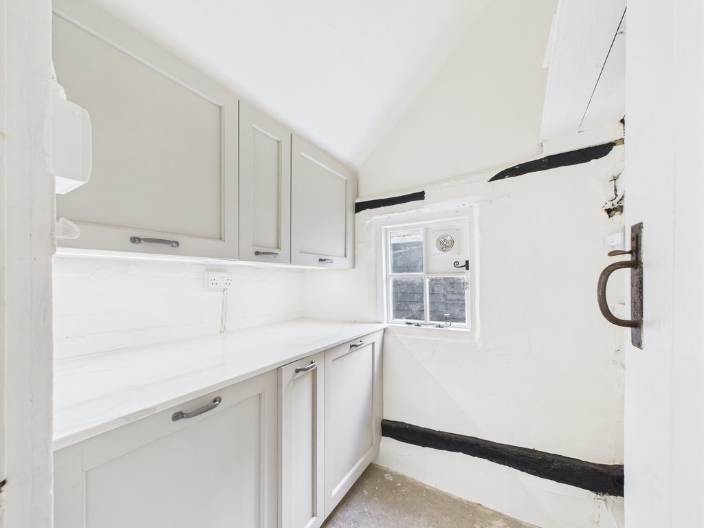 The property offers a wealth of character throughout the house, with extensive beams, fireplaces and attractive parquet flooring in the ground floor reception rooms. The property is approached through an historic front door to a small porch, that in turn leads into a living room, with a large Inglenook fireplace, that the vendor advised us previously housed a log burner. This room is flanked by a cosy sitting room, with a fireplace and bay window to the side and a dining room or snug set at the opposite end of the cottage. To the rear there is a modern fitted kitchen, with marble work surfaces, an integrated hob & oven and a separate utility room. The first floor features two double bedrooms, with a walk-in storage cupboard and a modern refitted shower room.