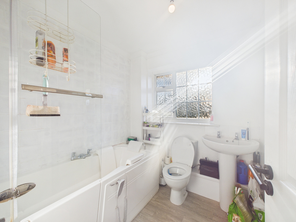 The front door opens into a hall with stairs leading to the first floor and a door opening to the living room, which has a large bay window flooding the room with natural light and overlooking the front garden. The kitchen/breakfast room offers plenty of space for a range of appliances, with space for a breakfast bar or table and has a door, opening out to a conservatory lending extra living space which then leads out to the rear garden. To the first floor is the family bathroom with a white suite and a walk-in shower, and two generous double bedrooms, with the main bedroom boasting built in wardrobes.