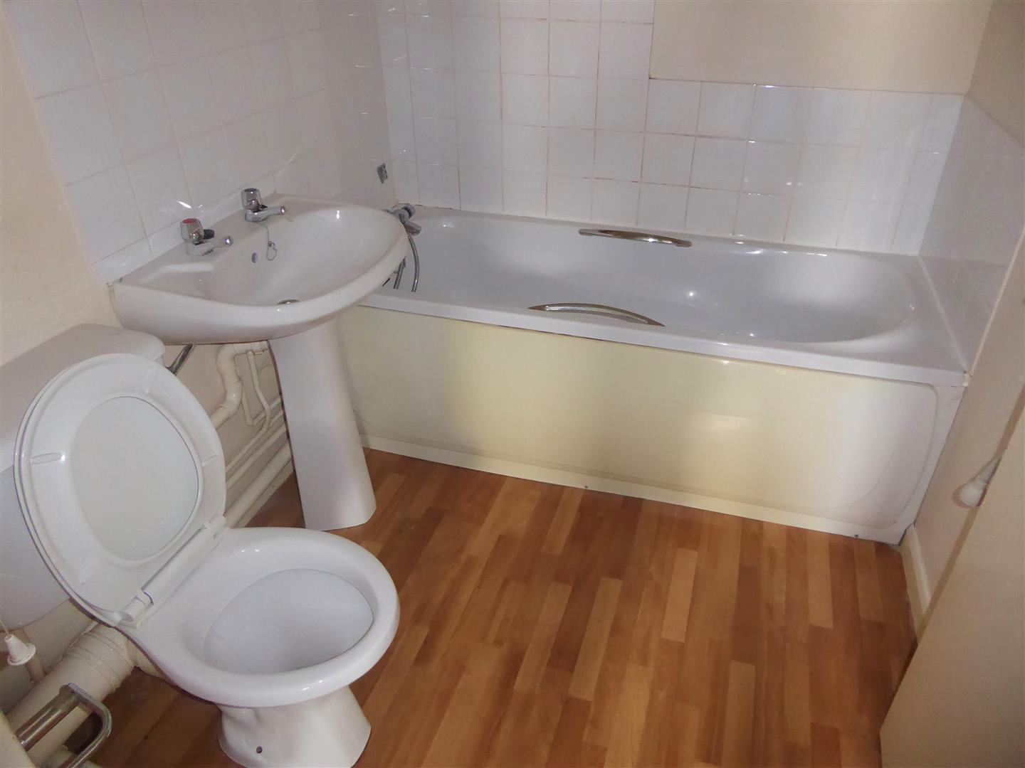 Bathroom - White suite comprising panel enclosed bath, pedestal wash hand basin, low level w/c.