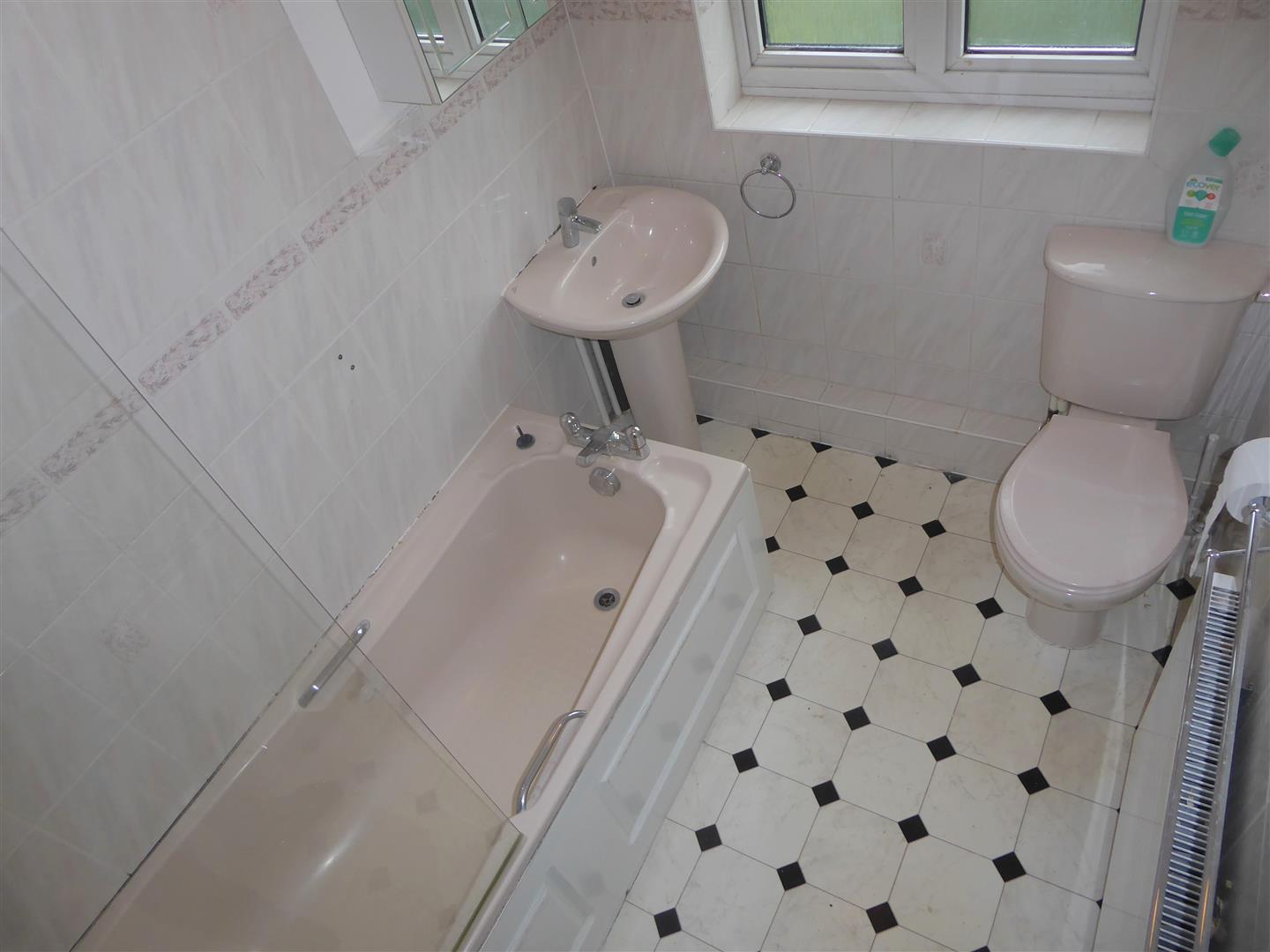 Bathroom - Coloured suite comprising panel enclosed bath with mixer tap, wall mounted shower unit, pedestal wash hand basin, part tiled walls, radiator, rear aspect double glazed window.
