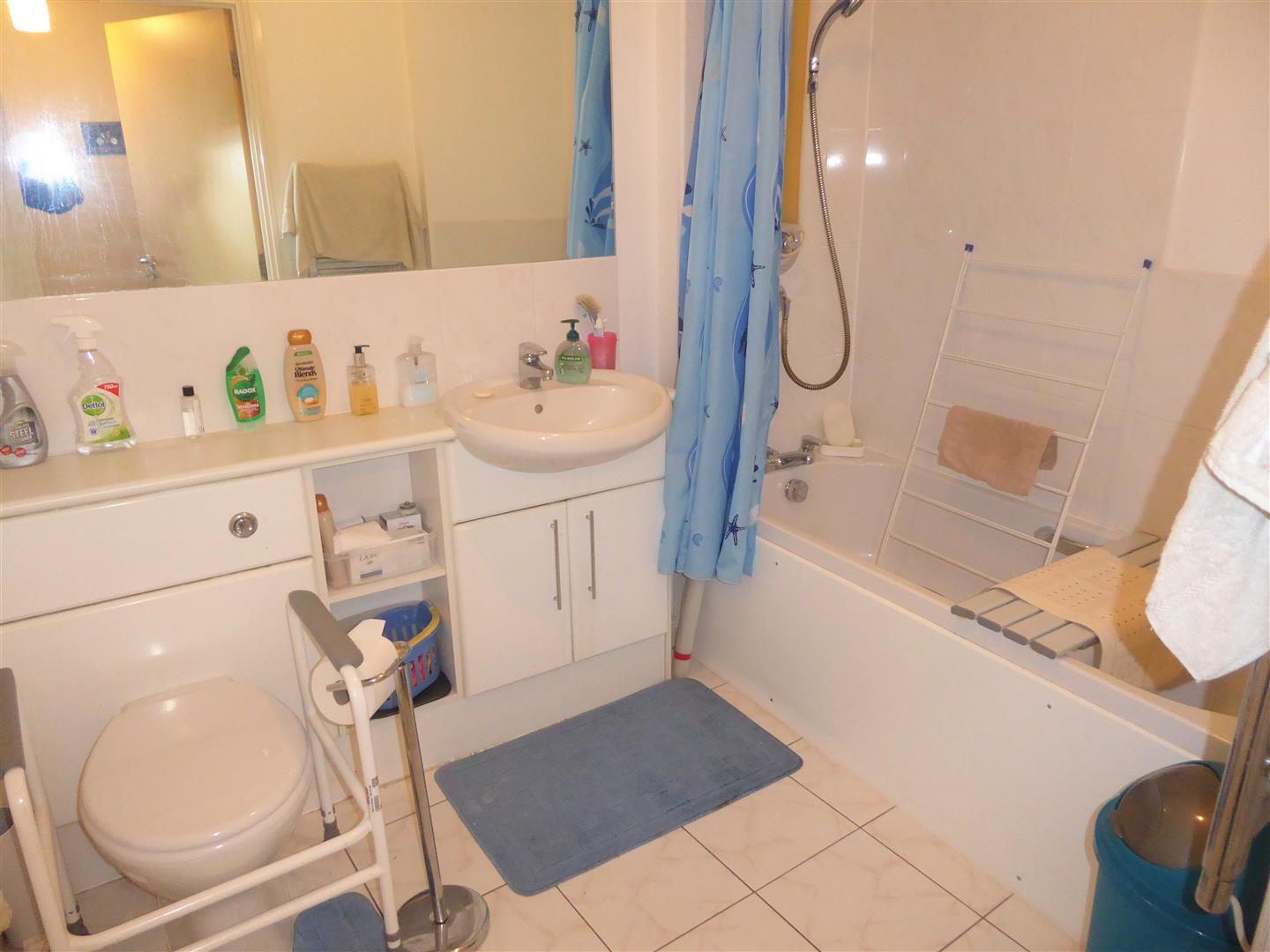 Bathroom - White suite comprising panel enclosed bath with mixer tap and wall mounted shower unit, wash hand basin with mixer tap and cupboard below, low level w/c, tiled flooring.