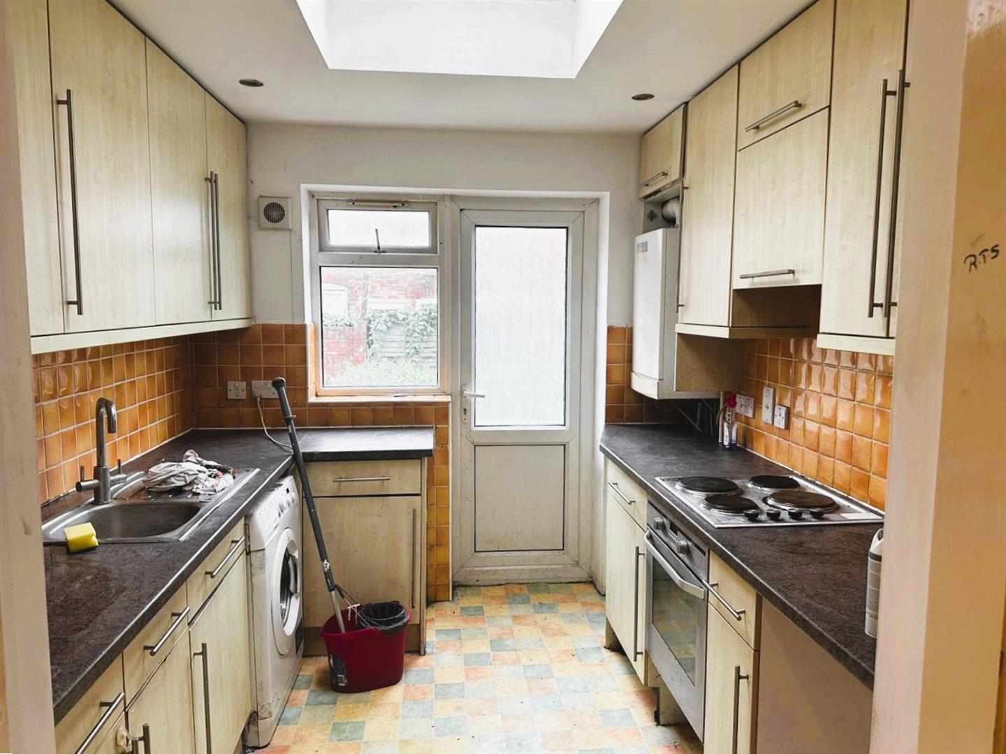Kitchen - Single drainer stainless steel sink unit with mixer tap and cupboard below, further range of floor wall mounted units, built-in hob and oven, part tiled walls, wall mounted boiler, space for washing machine, double glazed door to garden.