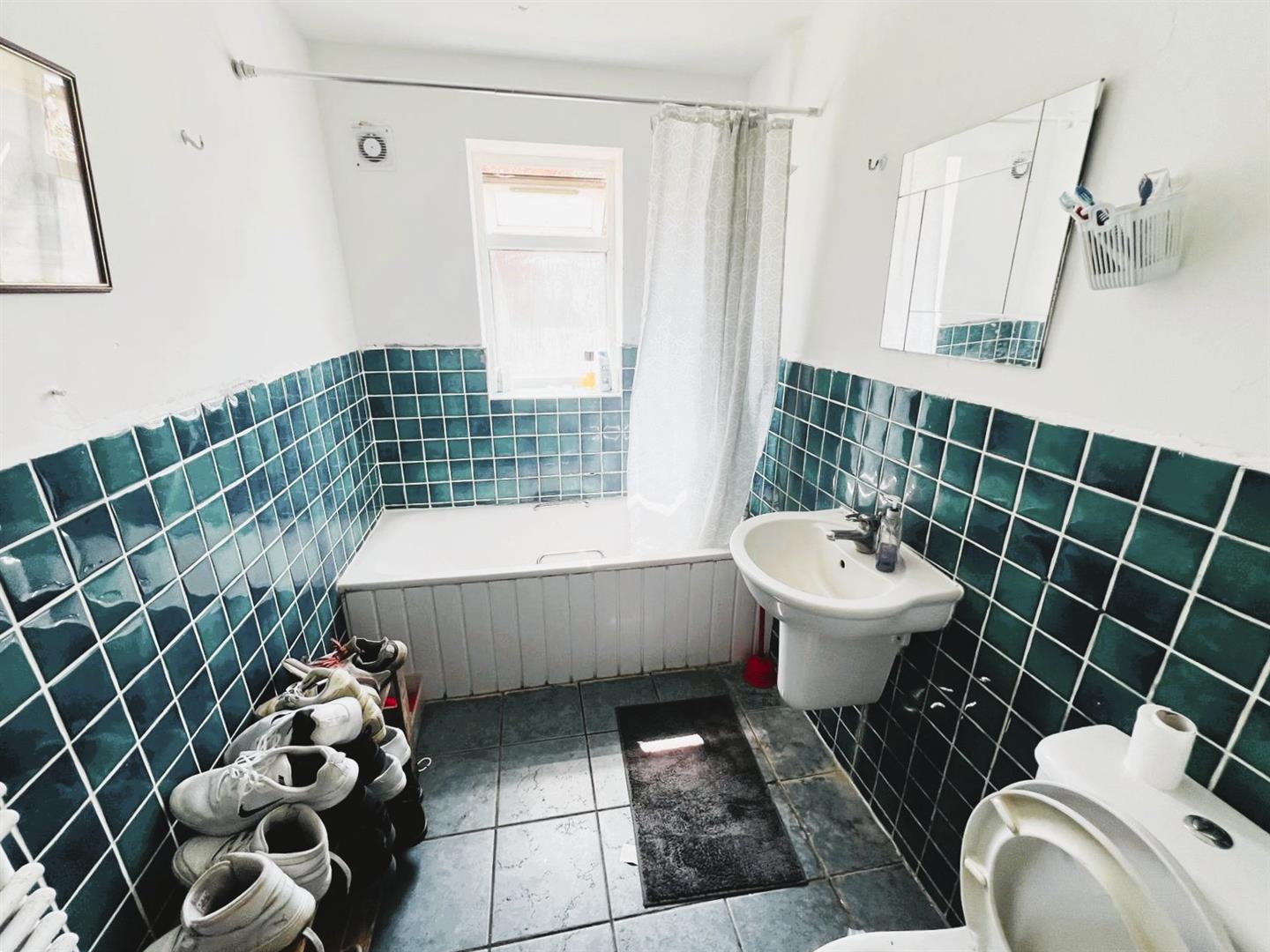 Bathroom - White suite comprising panel enclosed bath, wash hand basis, low level w/c, part tiled walls, heated towel rail.