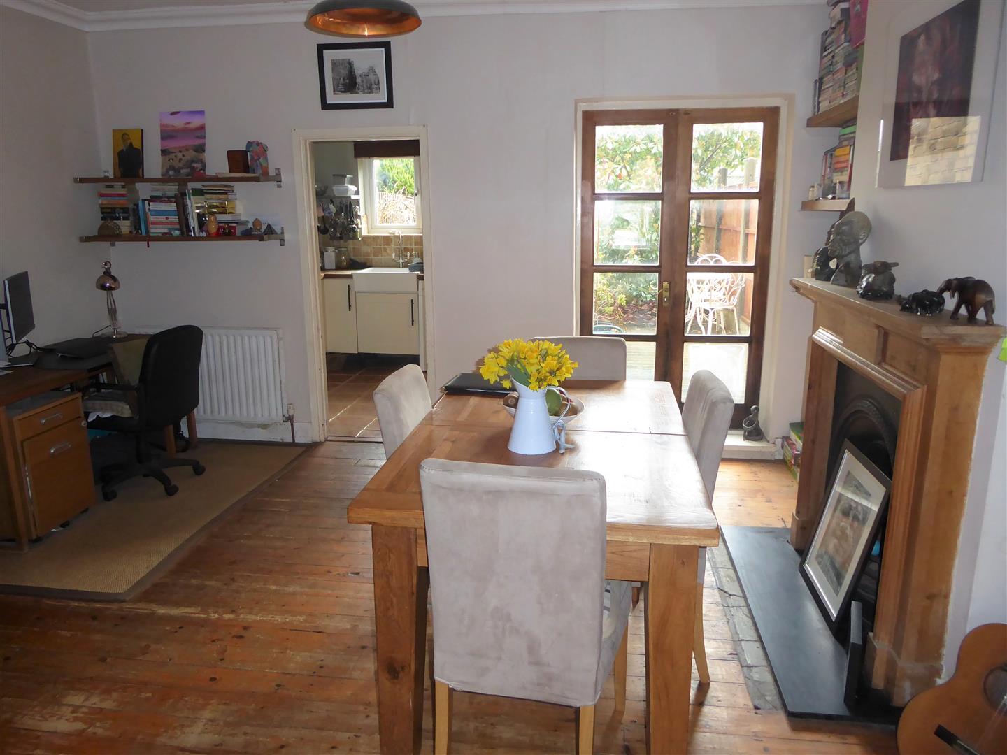 Dining Room - Feature fireplace with wooden mantle surround, exposed flooring, understairs cupboard housing gas and electric meters, double opening doors to garden and through to...