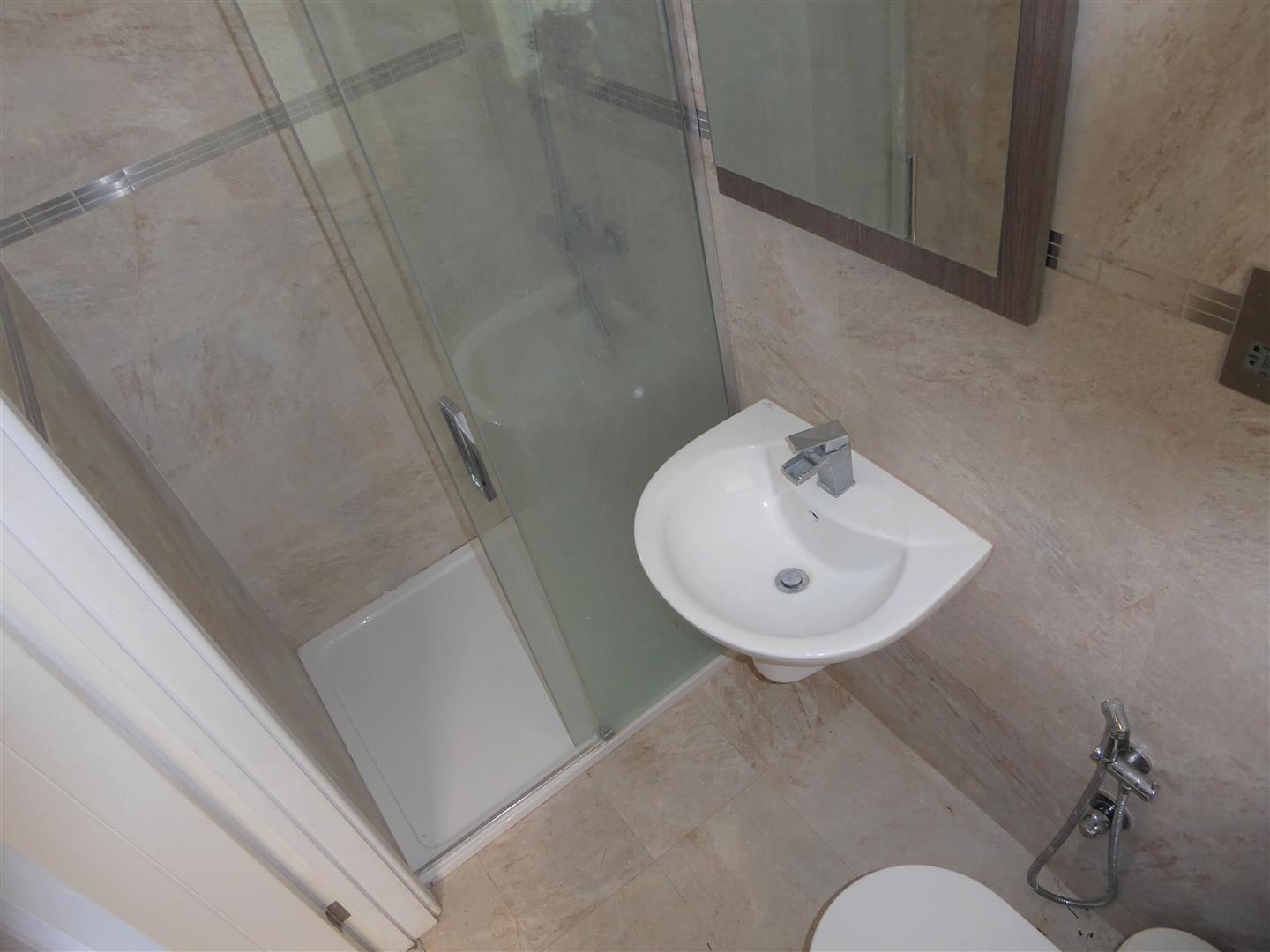Shower Room - Tiled enclosed shower cubicle with wall mounted shower unit, wash hand basin with mixer tap and vanity unit below, low level w/c, spotlights.