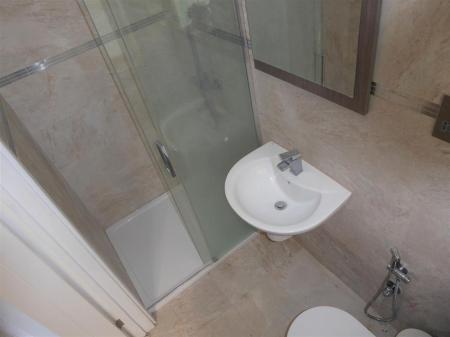 Shower Room - Tiled enclosed shower cubicle with wall mounted shower unit, wash hand basin with mixer tap, low level w/c, spotlights.