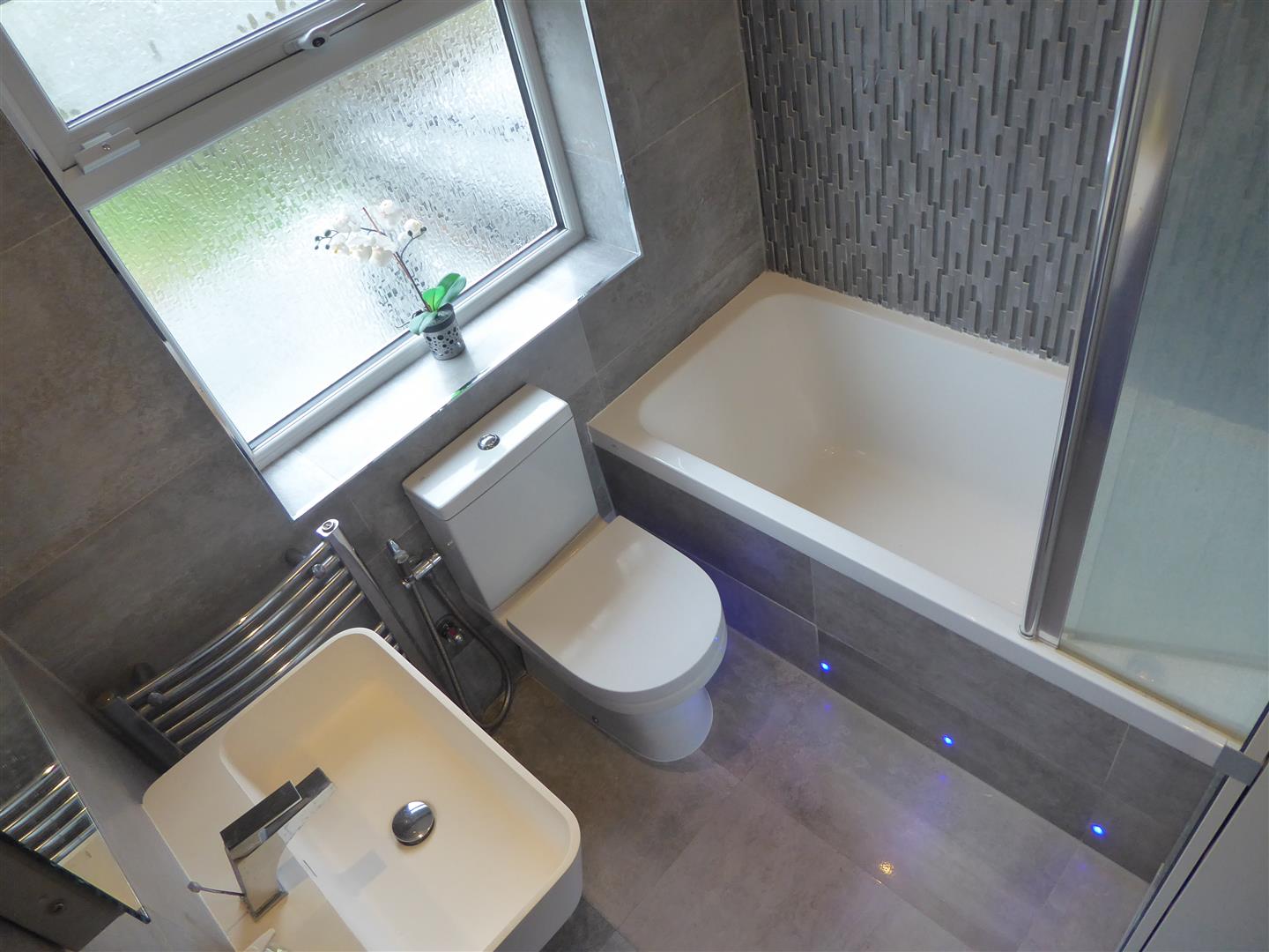 Modern Family Bathroom - White suite comprising tiled enclosed bath, wash hand basin with mixer tap, low level w/c, tiled walls, rear aspect double glazed window, heated towel rail, tiled flooring.