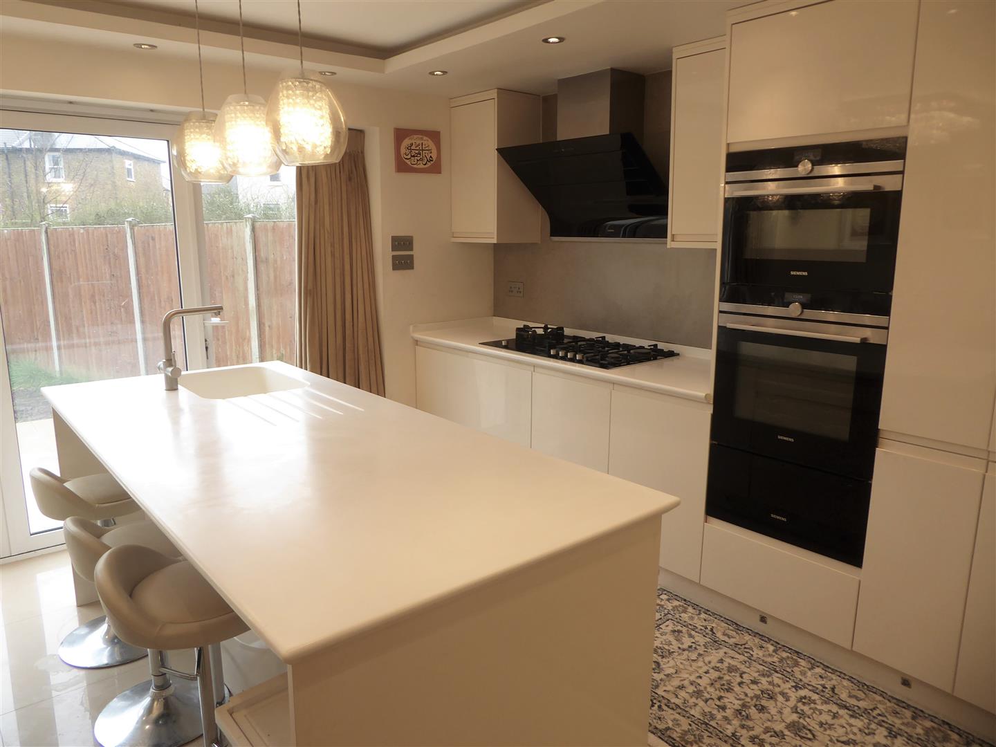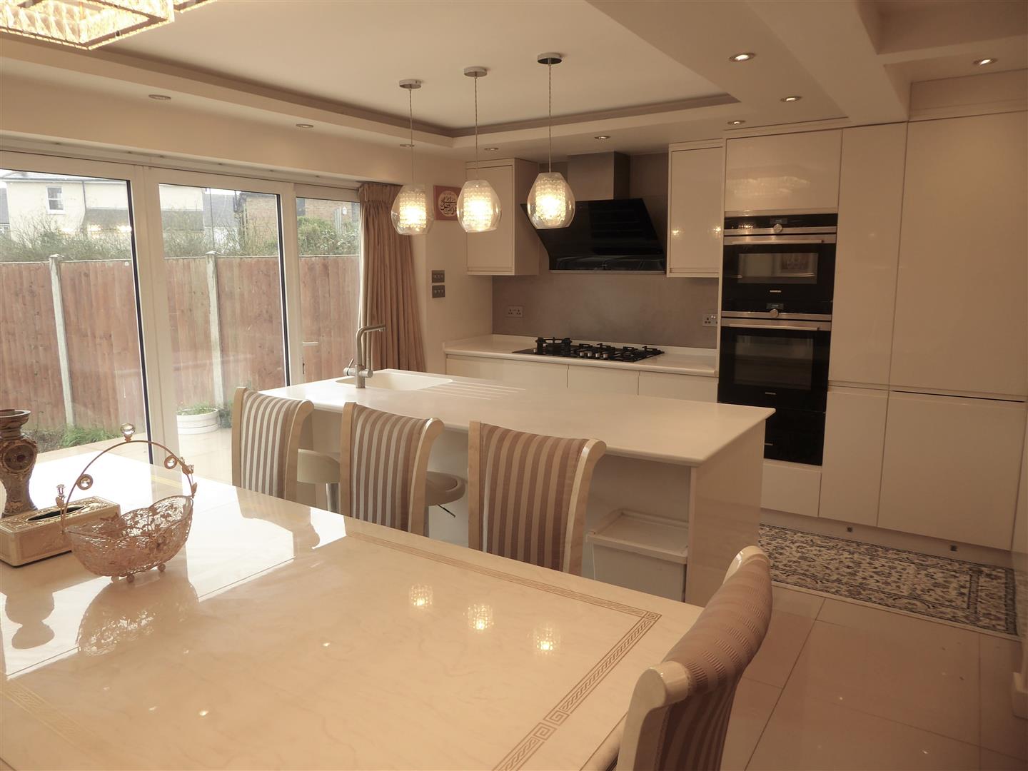 Extended Kitchen/Diner - Corian worktop breakfast bar with single drainer sink unit with mixer tap and cupboard below, built-in "Siemans" 5 ring hob with feature "Siemans" extractor hood above, built-in "Siemans" oven/microwave and hot plate, floor and wall mounted units, integrated "Siemans" dishwasher and integrated "Liebher" tall fridge/freezer, cupboard housing "Valiant" boiler and mega flow system, tiled flooring with underfloor heating, double glazed Bi-folding doors to rear garden.