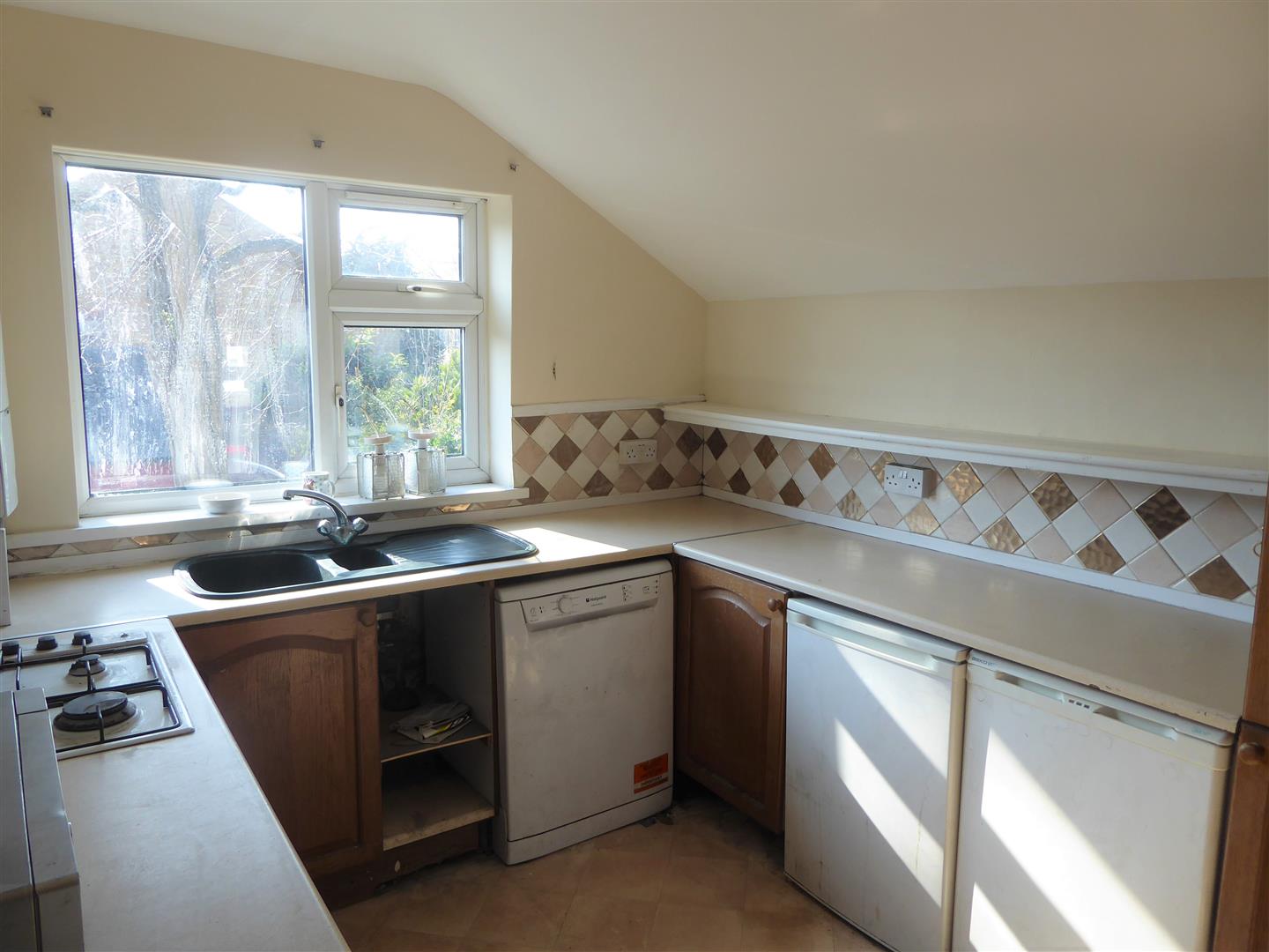 Kitchen - 1 1/2 bowl single drainer sink unit with mixer tap and cupboard below, further floor mounted units, built-in hob and oven below, space for fridge and freezer, wall mounted boiler, radiator, rear aspect window, walk in larder with shelving unit and double glazed window.