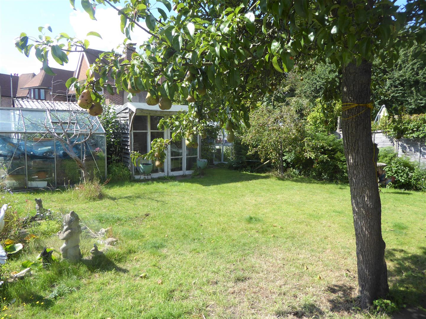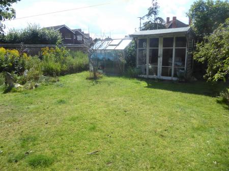 Rear - Paved patio area, flower beds and greenhouse, laid to lawn area.