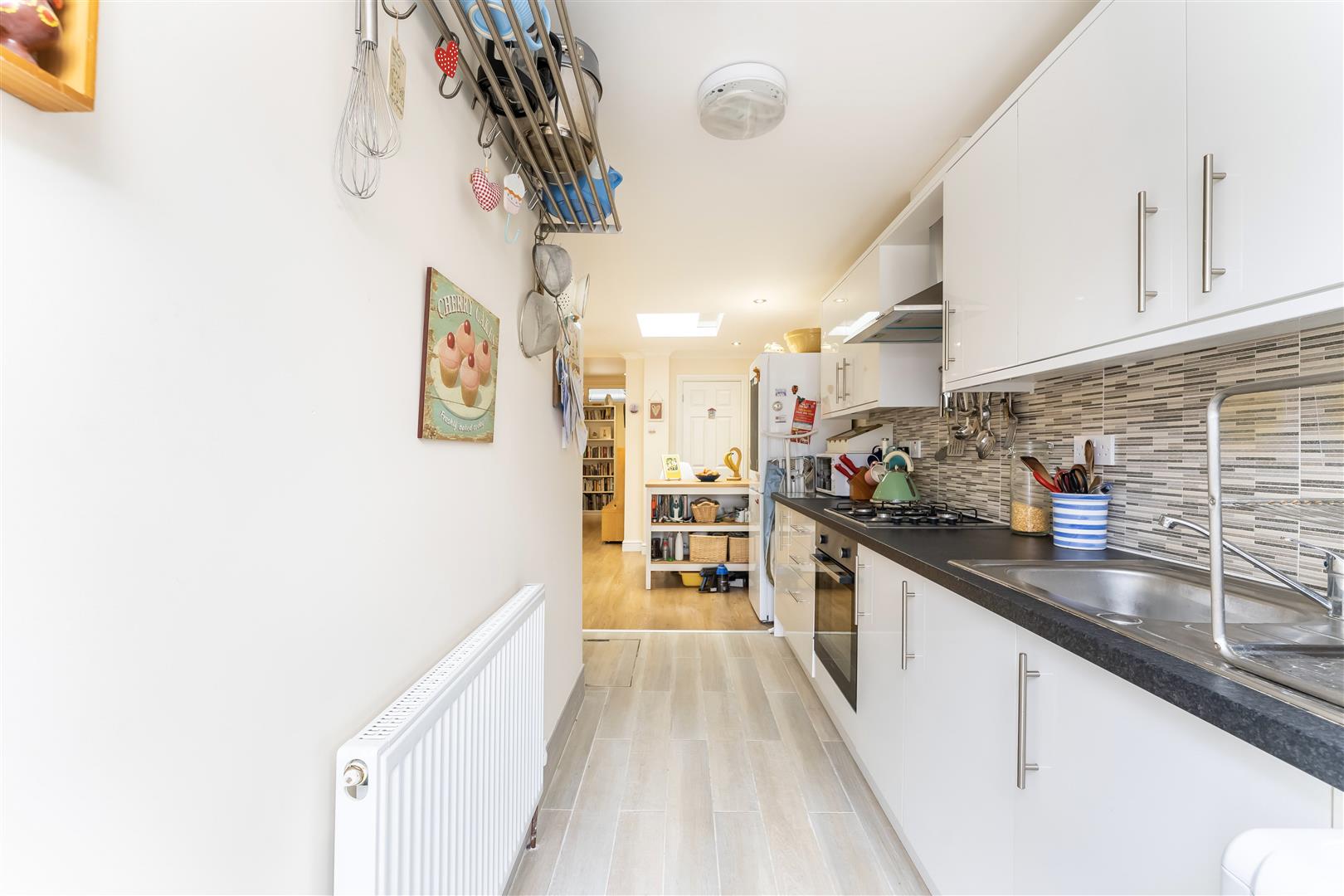 Modern Fitted Kitchen - Single drainer stainless steel sink unit with mixer tap and cupboard below, further wall and floor mounted units, built-in four ring gas hob with oven below and extractor hood above, space for washing machine, wall mounted "Main" combi boiler, part tiled walls, radiator, rear aspect double glazed window and double glazed door to garden.