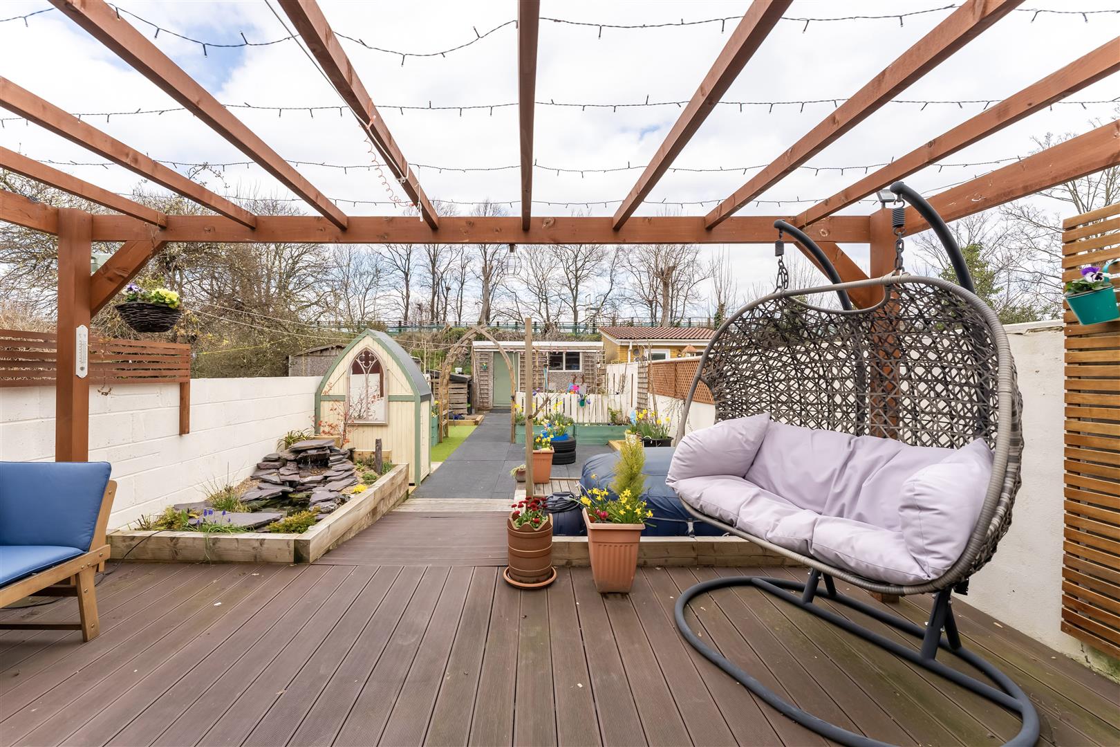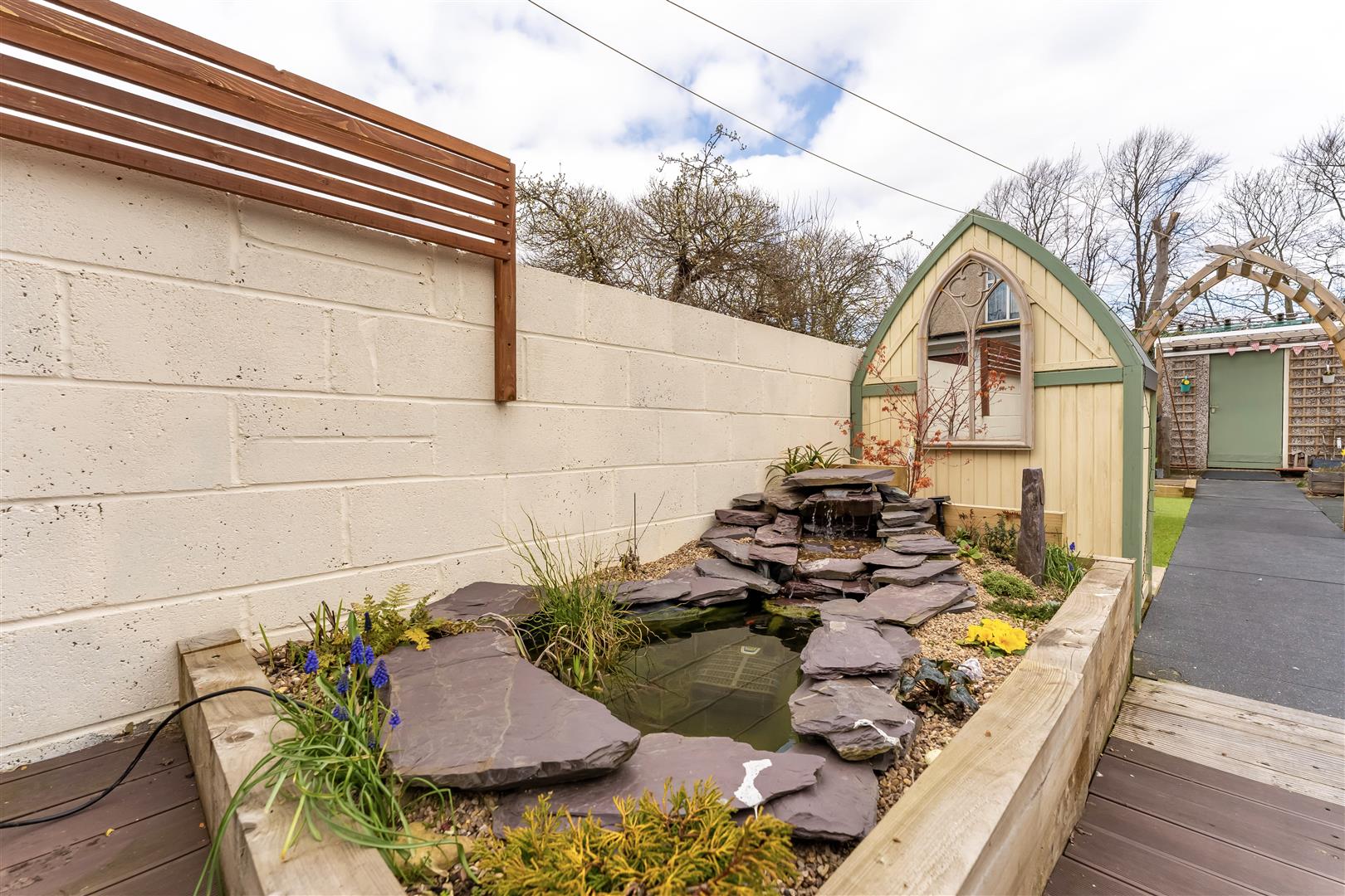 Private Rear Garden - Decking area with outside lighting and power, feature fish pond, further area with borders and access to ...