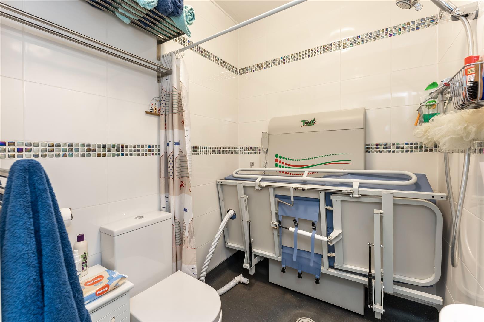 Shower Room - Tiled walls, wall mounted shower unit, low level w.c, wash hand basin.