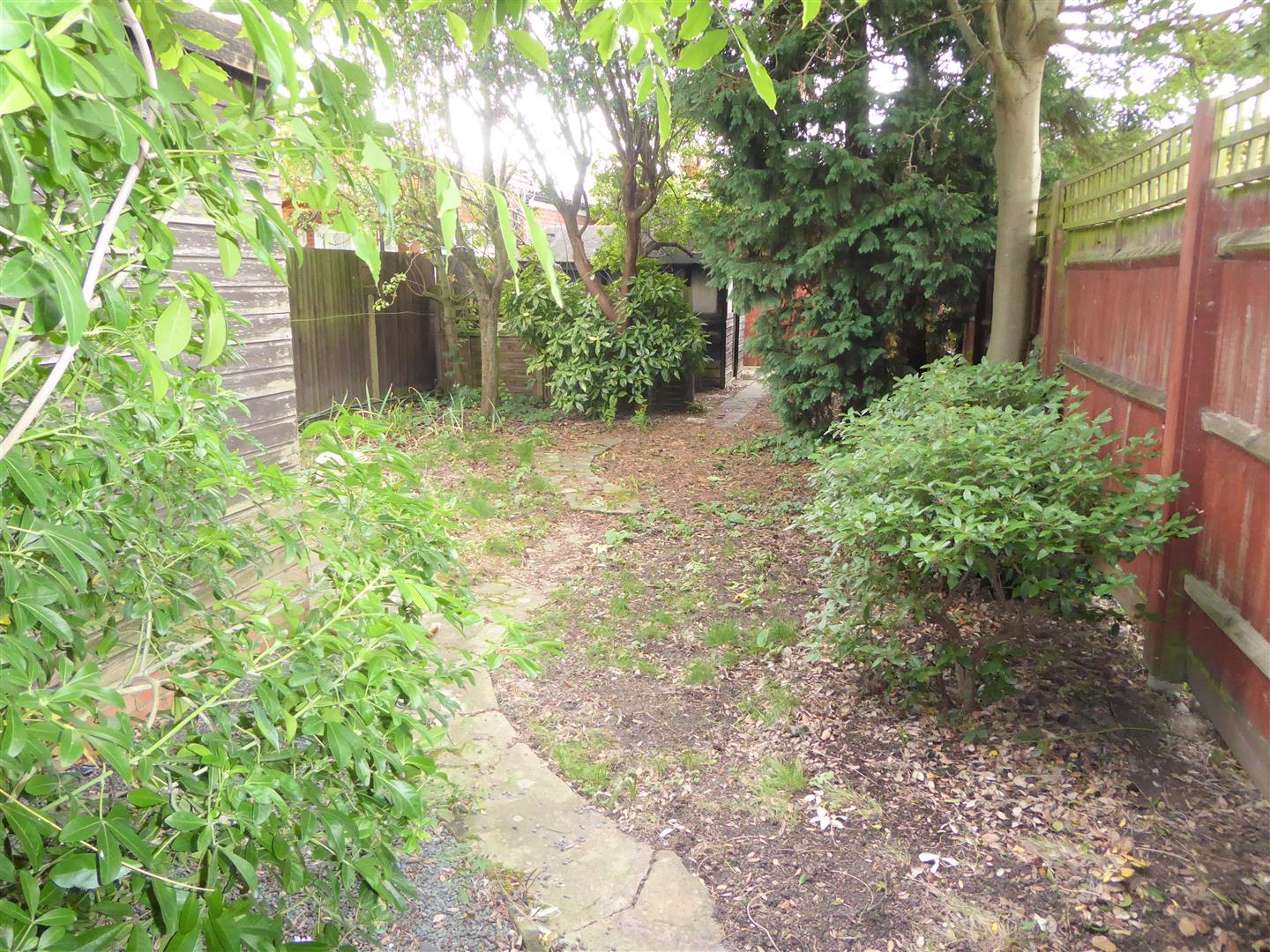 Rear Garden - Paved patio area, side access, shrub borders, block pathway to further area with shrubs, timber shed and workshop with power and lighting.