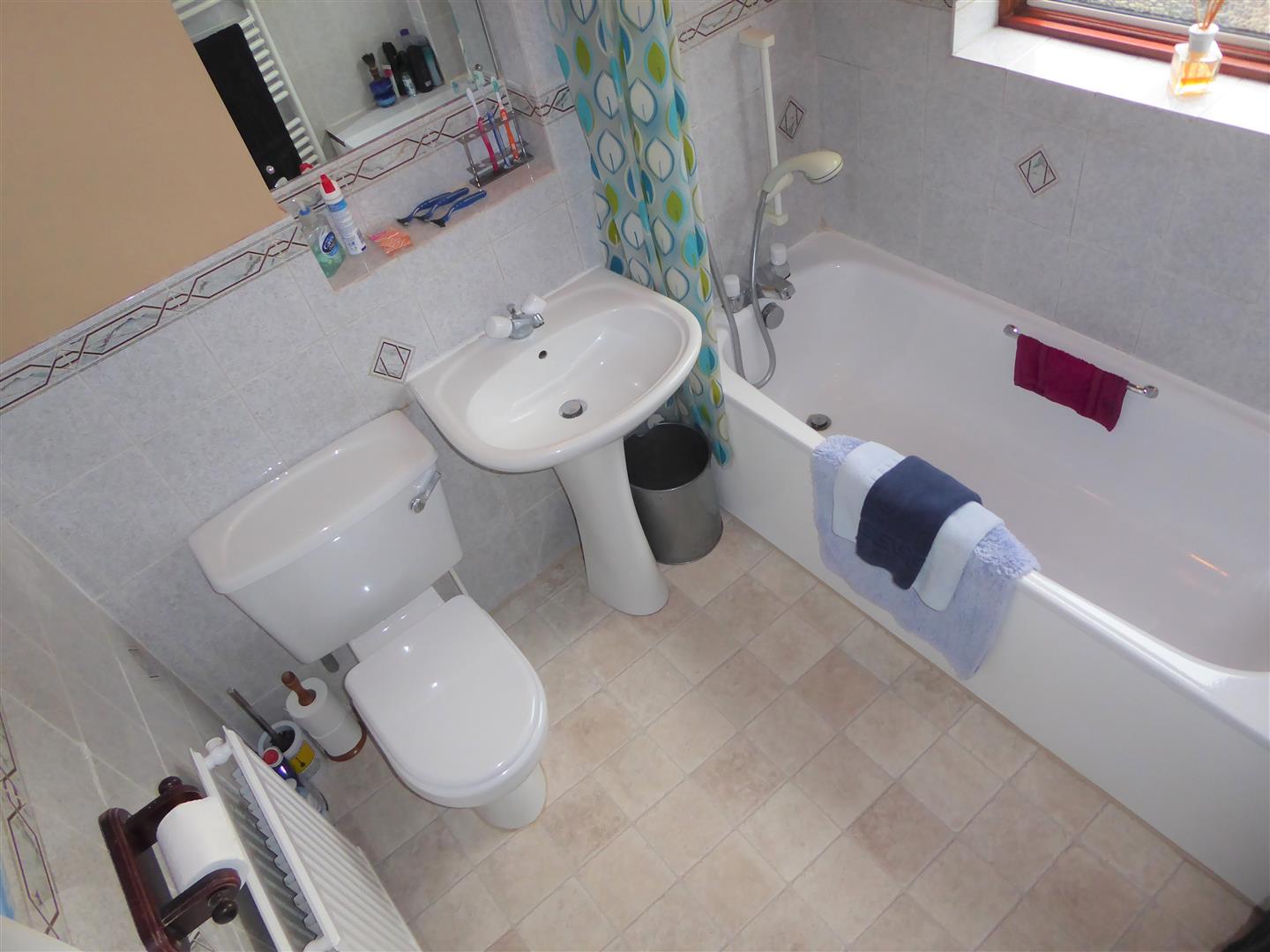 Bathroom - White suite comprising panel enclosed bath with mixer tap and shower attachment, pedestal wash hand basin, low level wc, part tiled walls, double radiator, heated towel rail, rear aspect double glazed window.