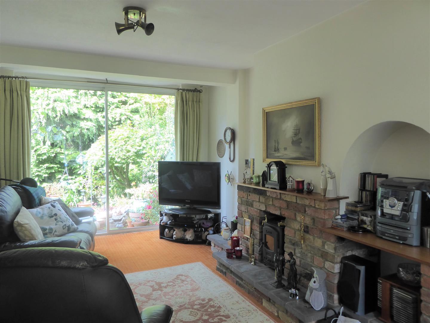 Through Lounge - Front aspect double glazed bay window, rear aspect double patio door, feature brick fireplace, radiator, carpet.