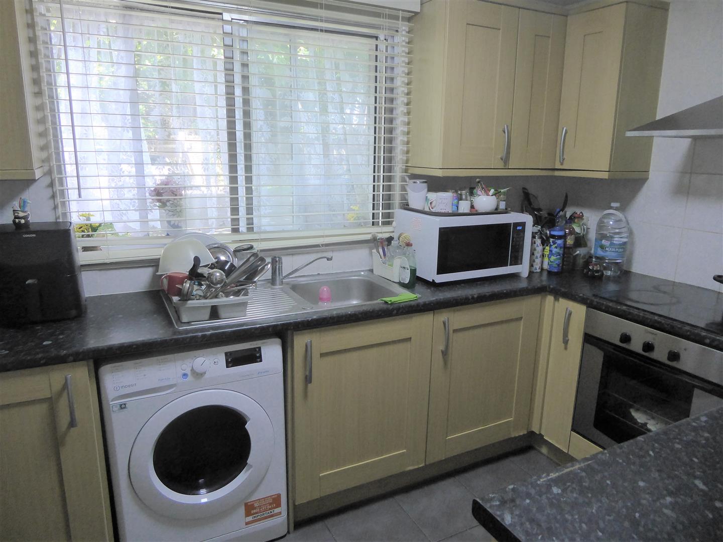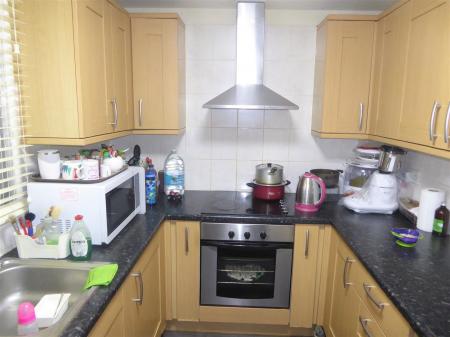 Kitchen - 3.600 x 2.248 (11'9" x 7'4") - Single drainer stainless steel sink unit with mixer tap and cupboard below, further wall and floor mounted units, built-in hob and oven below, space for washing machine and fridge/freezer, part tiled walls, tiled flooring, secondary glazed window.