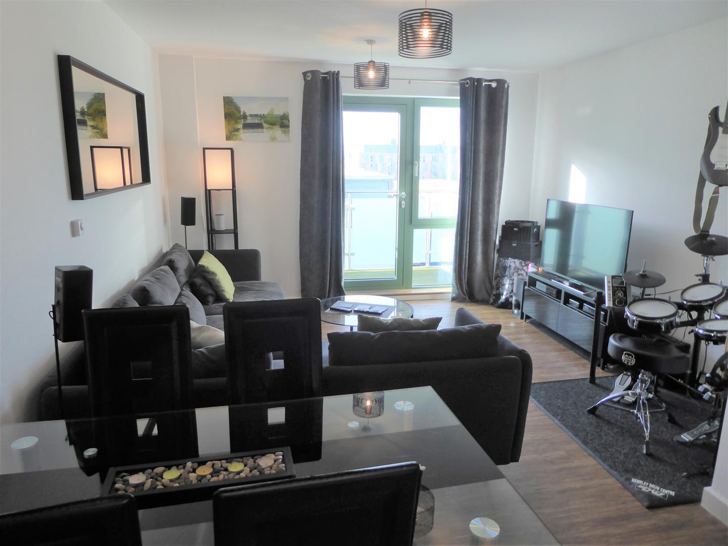 - Open plan lounge with balcony and kitchen