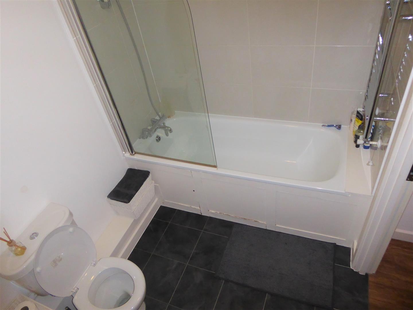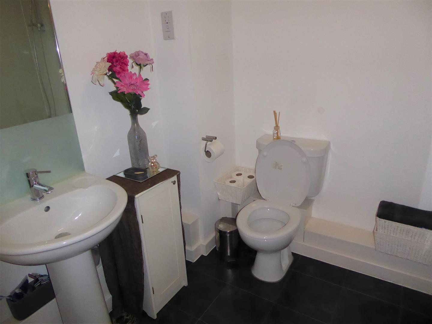 Family Bathroom - Modern white suite comprising panel enclosed bath with mixer tap and shower attachment, pedestal wash hand basin, low level w.c, part tiled walls, tiled flooring, heated towel rail.