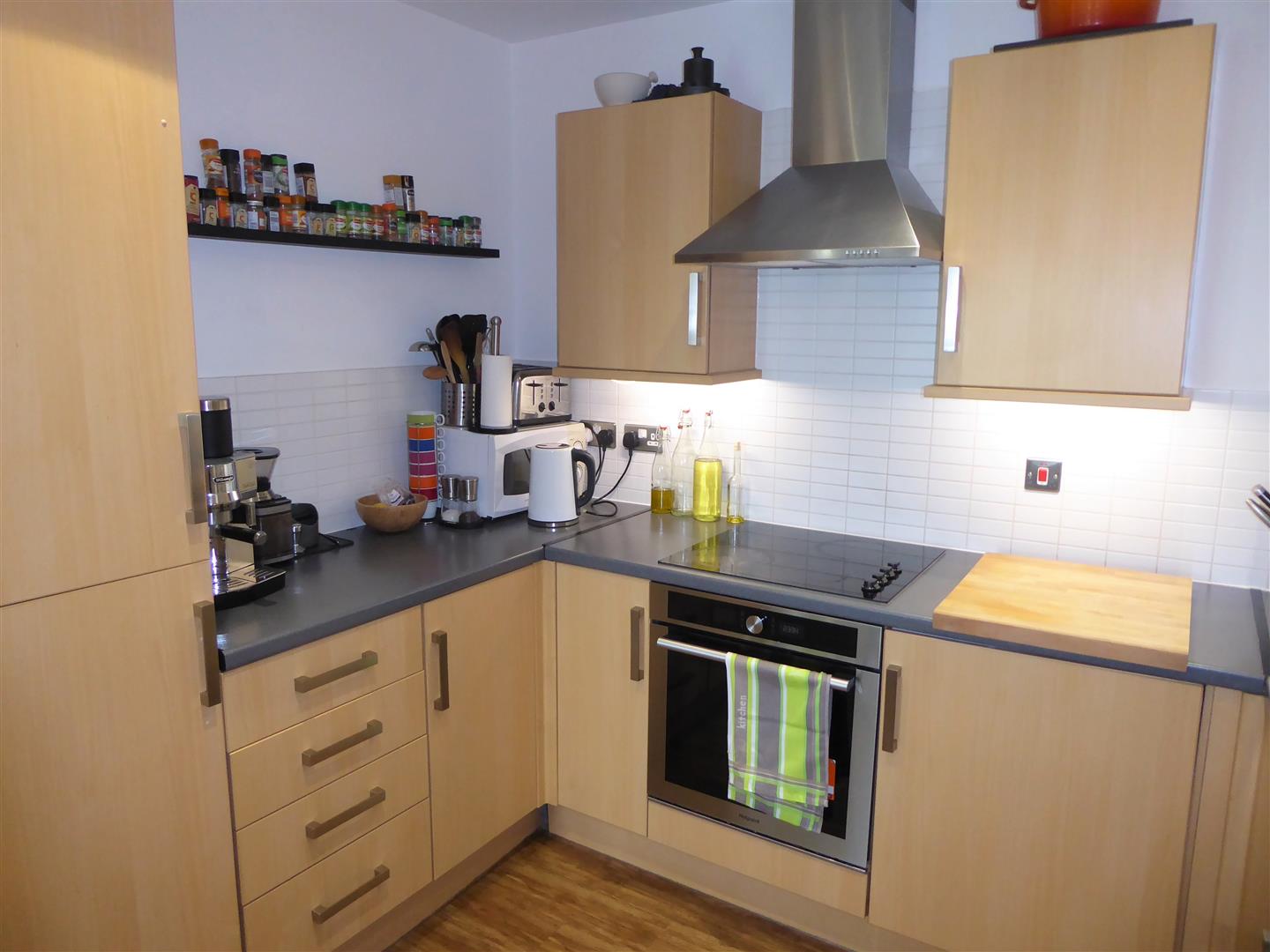 Entrance Hallway - Laminate flooring, power point, heated storage cupboard housing meters, entry phone system, further storage cupboard housing boiler, doors to rooms.