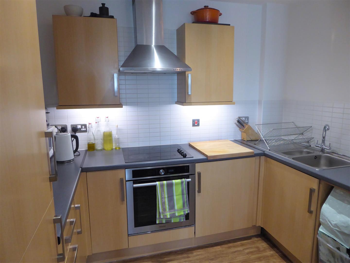 Kichen - 1 1/2 bowl single drainer sink unit with mixer tap and cupboard below, further wall and floor mounted units, built-in hob with oven below and extractor above, power points, integrated fridge/freezer and washing machine, spotlights, tiled flooring.