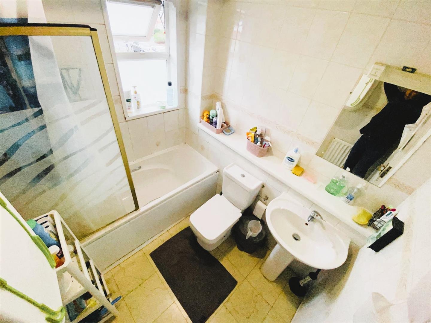 Bathroom - Panel enclosed bath, low level w/c, pedestal wash hand basin, tiled walls, double glazed window.
