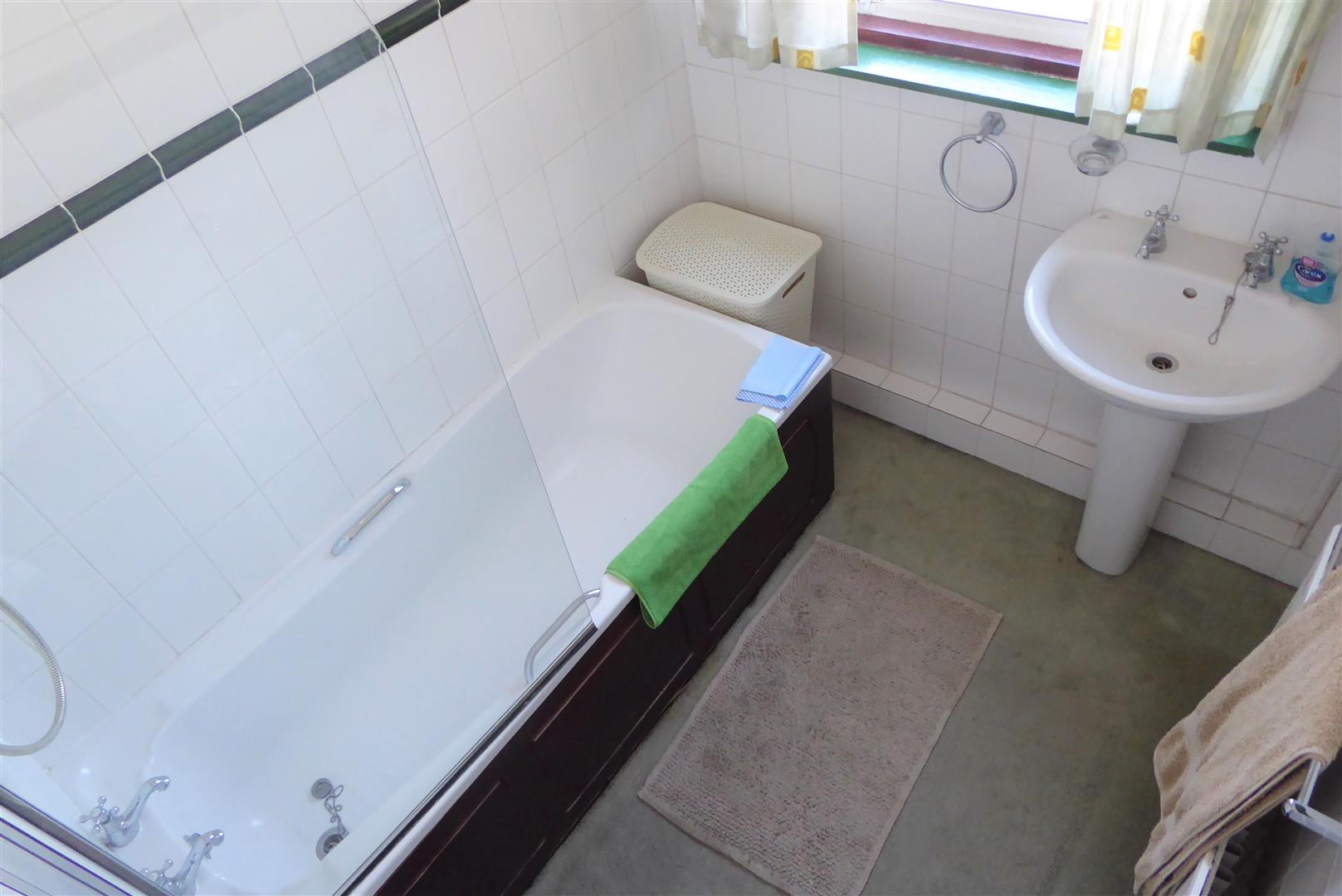Bathroom - White suite comprising panel enclosed bath with wall mounted shower cubicle, pedestal wash hand basin, part tiled walls, double glazed window.