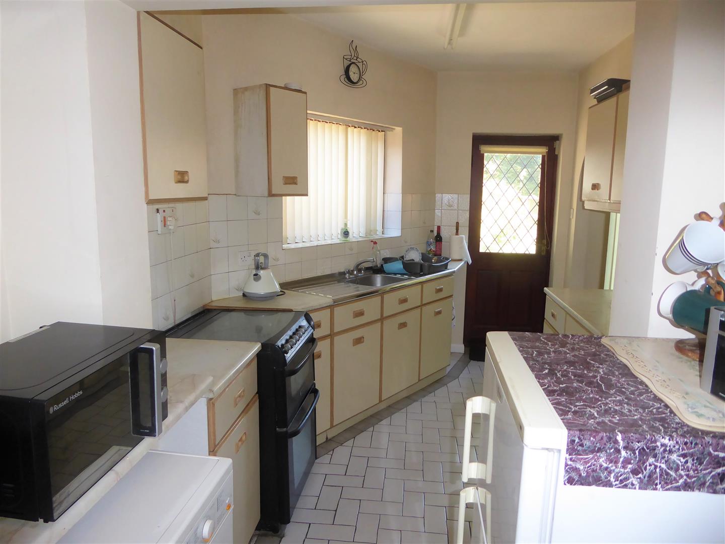 Extended Kitchen - Double drainer stainless steel sink unit with mixer tap and cupboard below, further wall and floor mounted units, space for cooker, washing machine and fridge, part tiled walls, wall mounted boiler, door to garden.