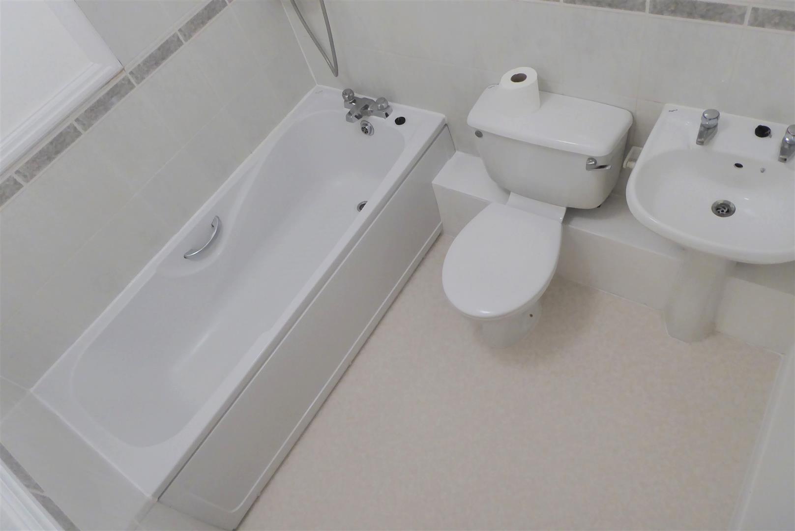 Bathroom - Modern white suite comprising panel enclosed bath with mixer tap, wall mounted shower unit, pedestal wash hand basin, low level w.c, part tiled walls, extractor fan, "Dimplex" heater.