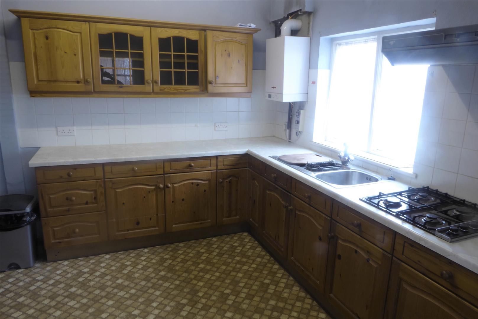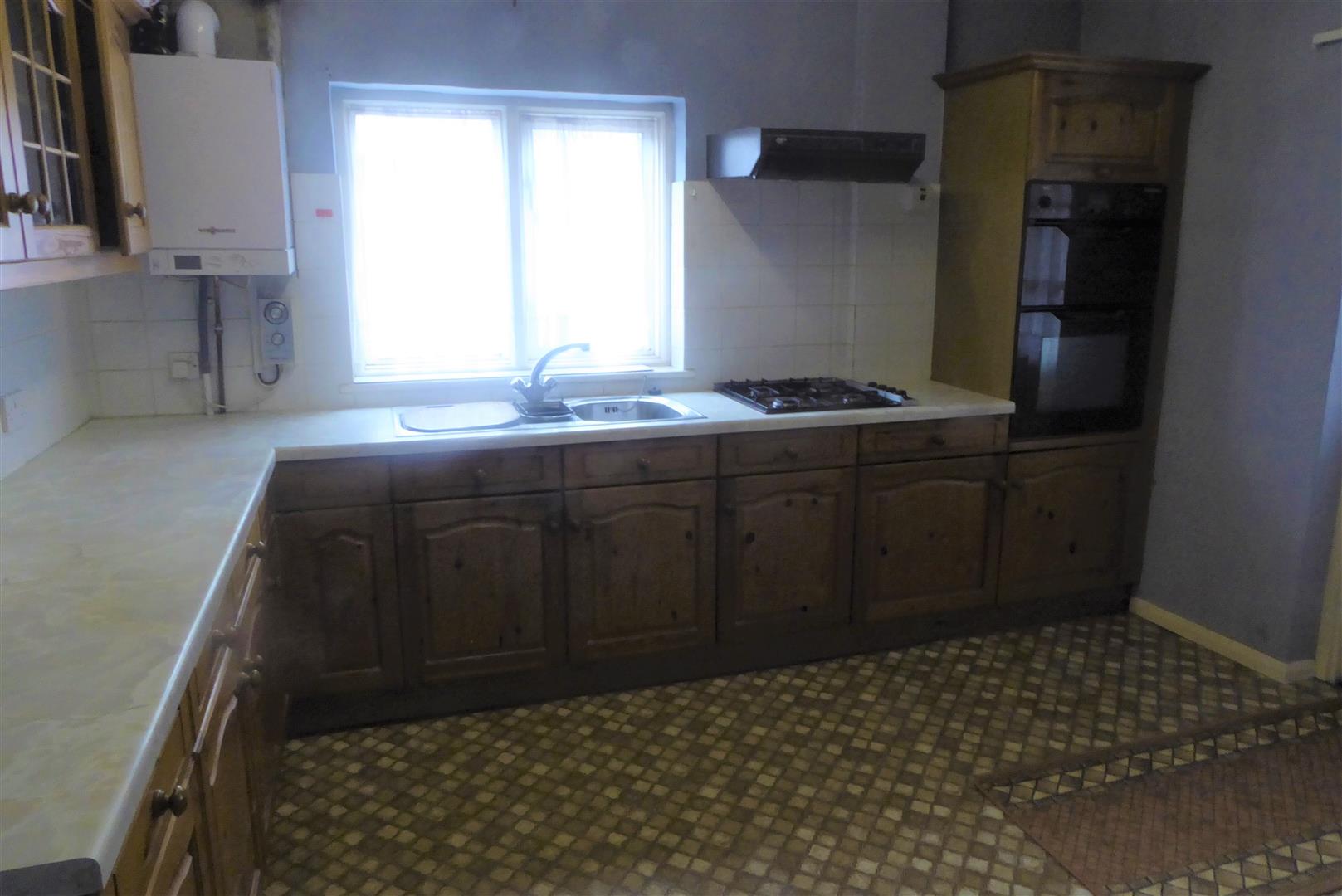 Kitchen - Double bowl stainless steel sink unit with mixer tap and cupboard below, further wall and floor mounted units, built-in hob and double oven, part tiled walls, wall mounted boiler, power point, rear aspect double glazed window and door to garden.