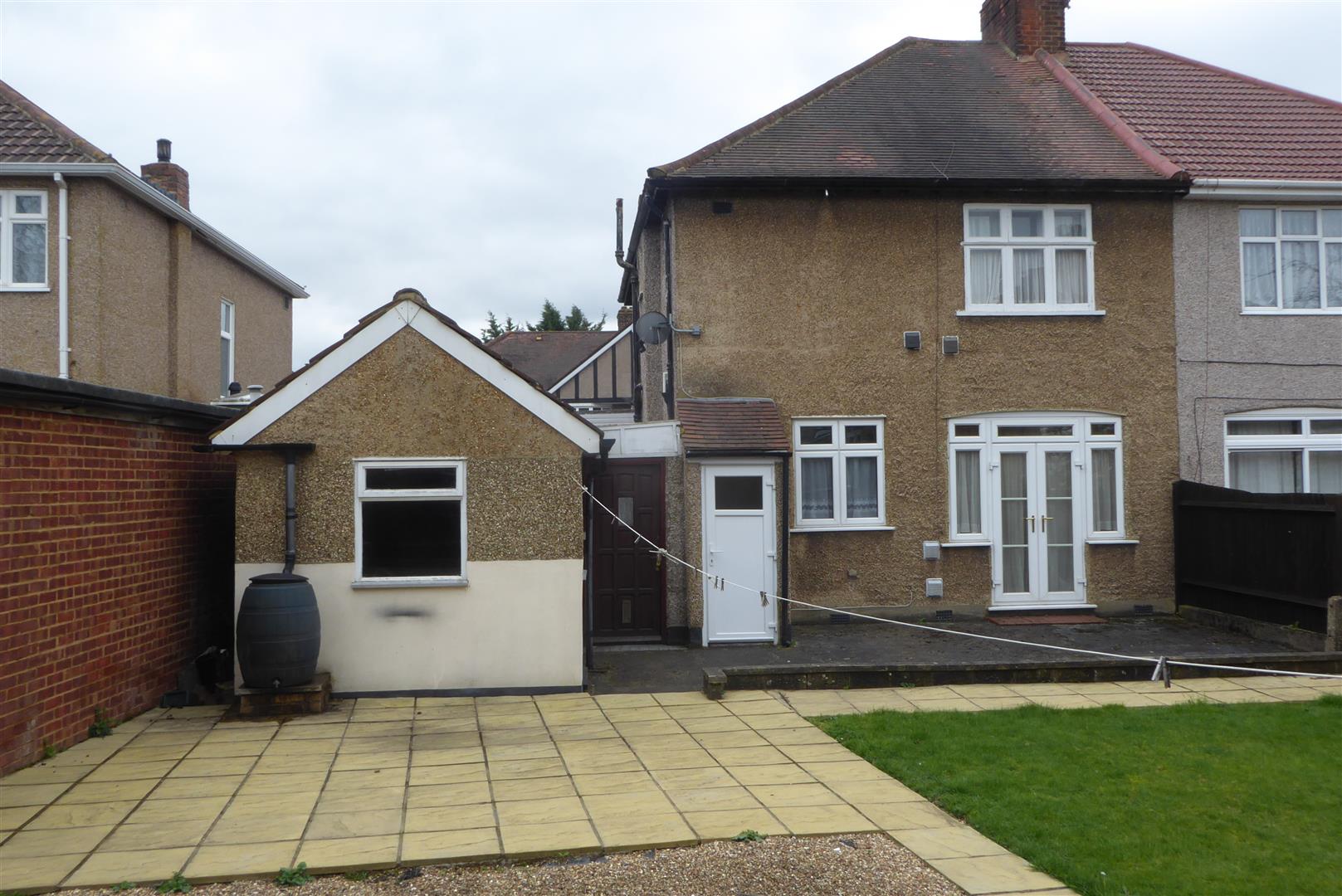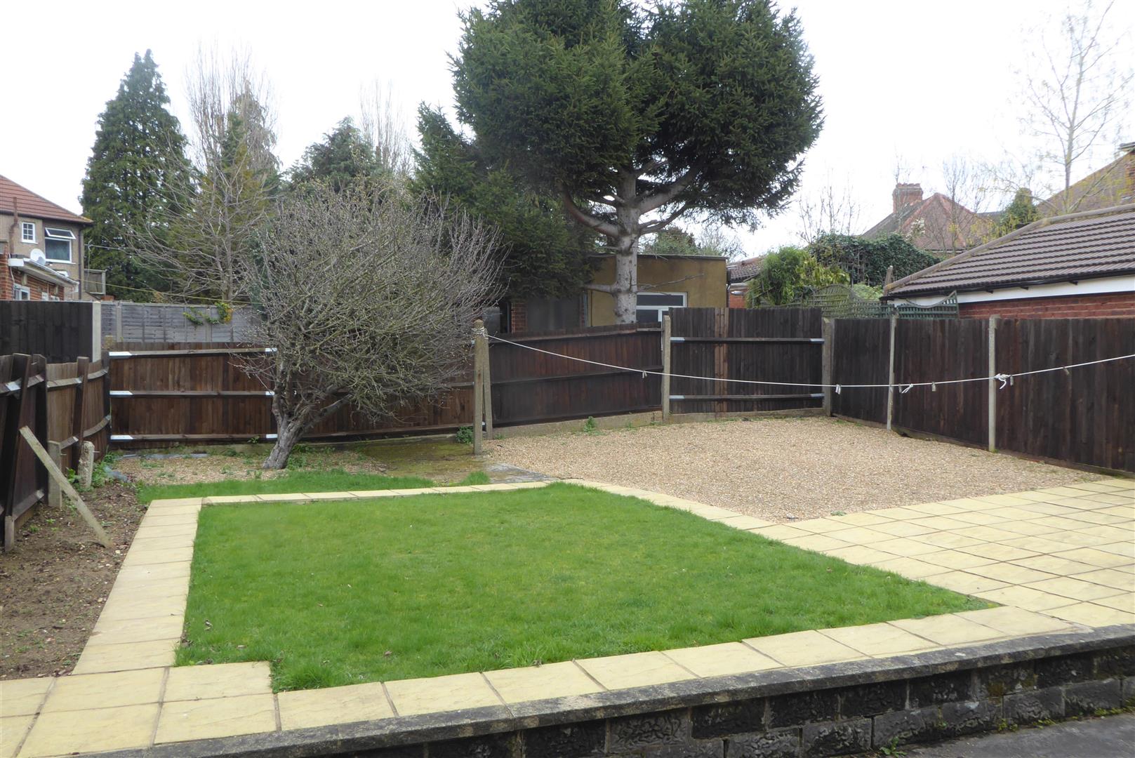 Rear Garden - Patio area, rest laid to lawn, outside w/c.