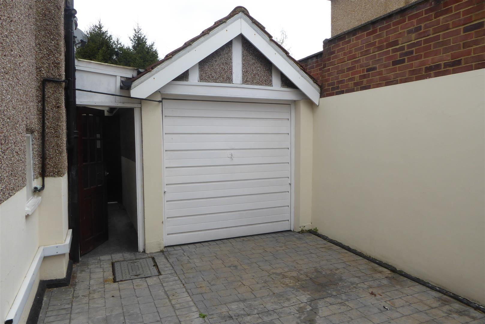 Front - Driveway with off street parking and flower beds with side gate and double gates leading through to further driveway, leading to garage with up and over door, power and lighting.