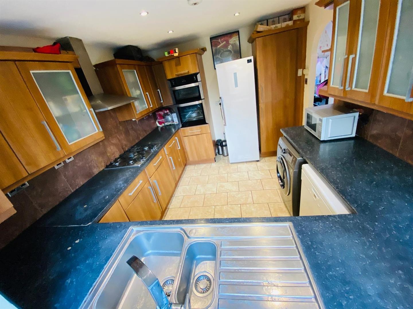 Kitchen - 1 1/2 single drainer stainless steel sink unit with mixer tap and cupboard below, further wall and floor mounted units, 5 ring hob, extractor fan, oven, space for washing machine, dishwasher, space for fridge/freezer, tiled walls and flooring, spotlights, front aspect double glazed windows.
