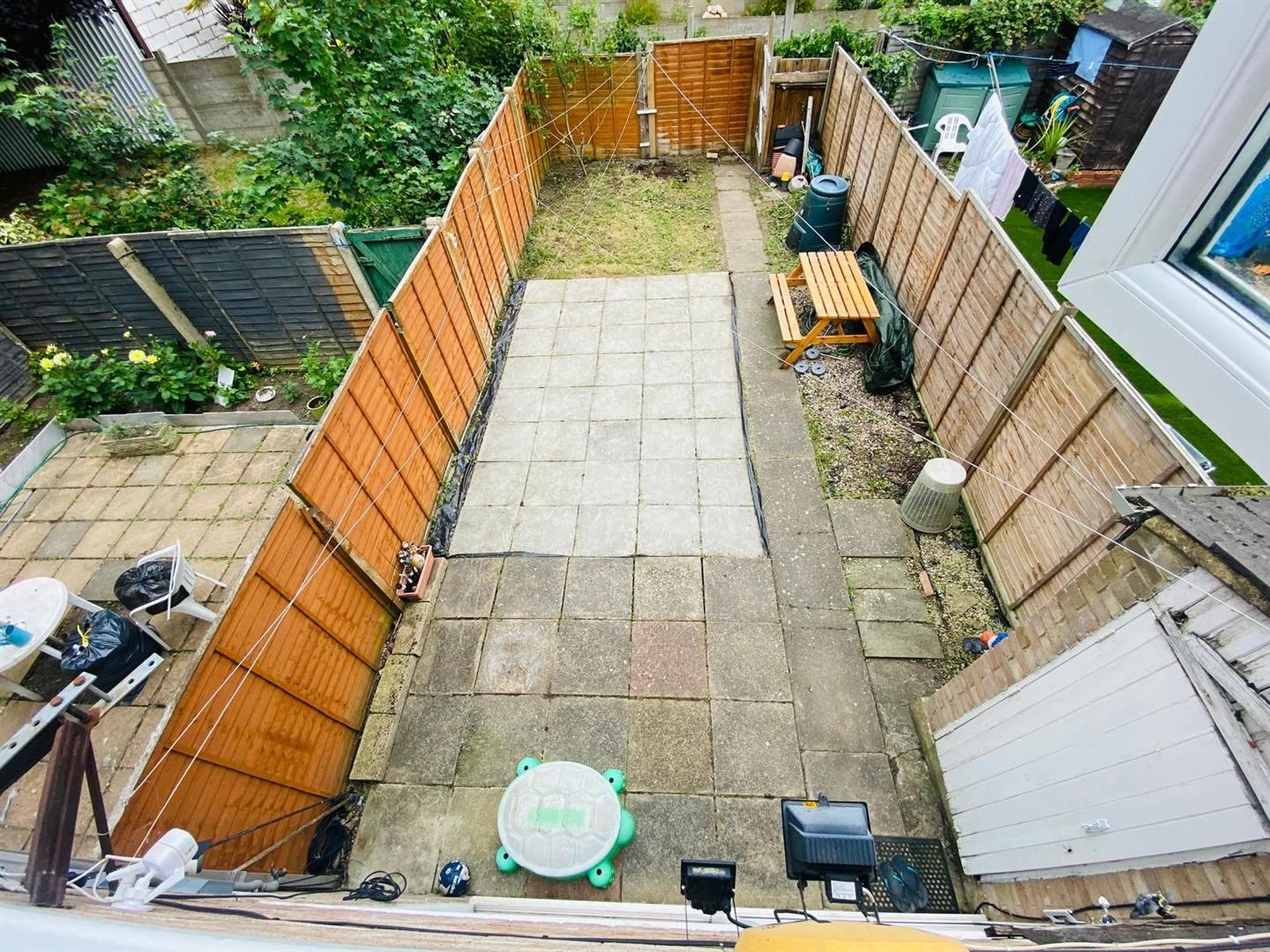 Rear Garden - Paved area, rest laid to lawn, rear access and storage shed.