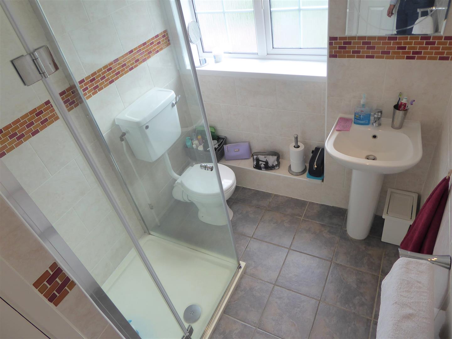 Re-Fitted Modern Shower Room - Tiled enclosed shower cubicle with wall mounted shower unit, wash hand basin, low level w.c, tiled walls and flooring, front aspect double glazed window, electric heating.