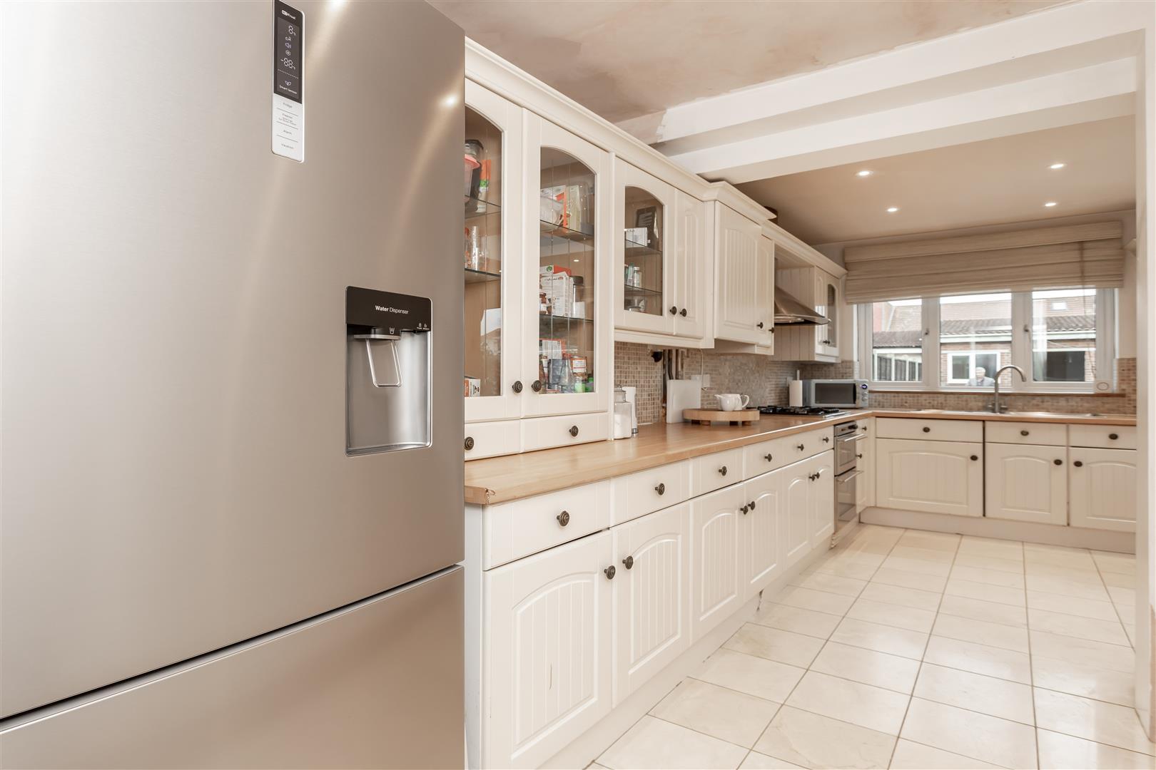 Extended L'shaped Kitchen/Diner - Single drainer stainless steel sink unit with mixer tap and cupboard below, further wall and floor mounted units, built-in five ring gas hob with built in oven below, part tiled walls, power point, cupboard housing "Worcester" boiler, space for fridge/freezer, integrated washing machine and space for integrated dishwasher, spotlights, tiled flooring, rear aspect double glazed window, through to...
