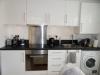 Kitchen Area - Single drainer stainless steel sink unit with mixer tap and cupboard below, further wall and floor mounted units, built-in hob and oven below, space for washing machine, cupboard housing wall mounted boiler.