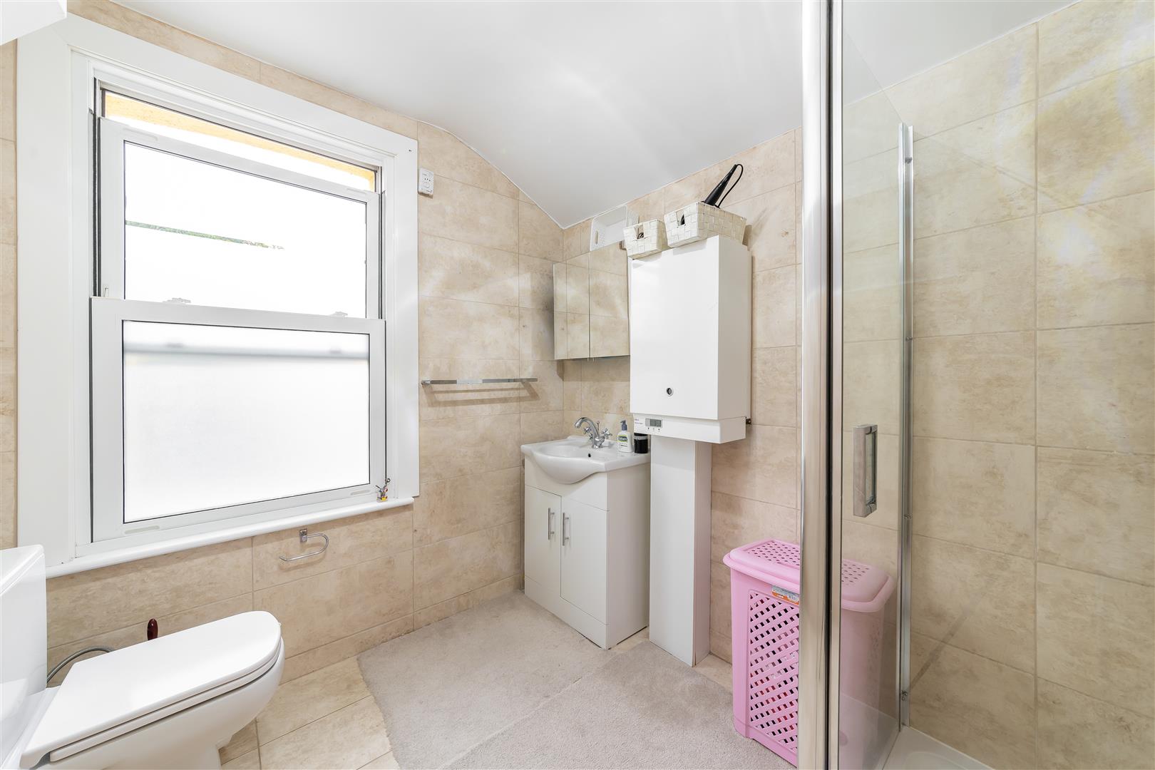 En-Suite Shower Room - Tiled enclosed shower cubicle, wall mounted shower unit, wash hand basin with vanity unit below, low level w.c, rear aspect double glazed window, boiler for hot water.