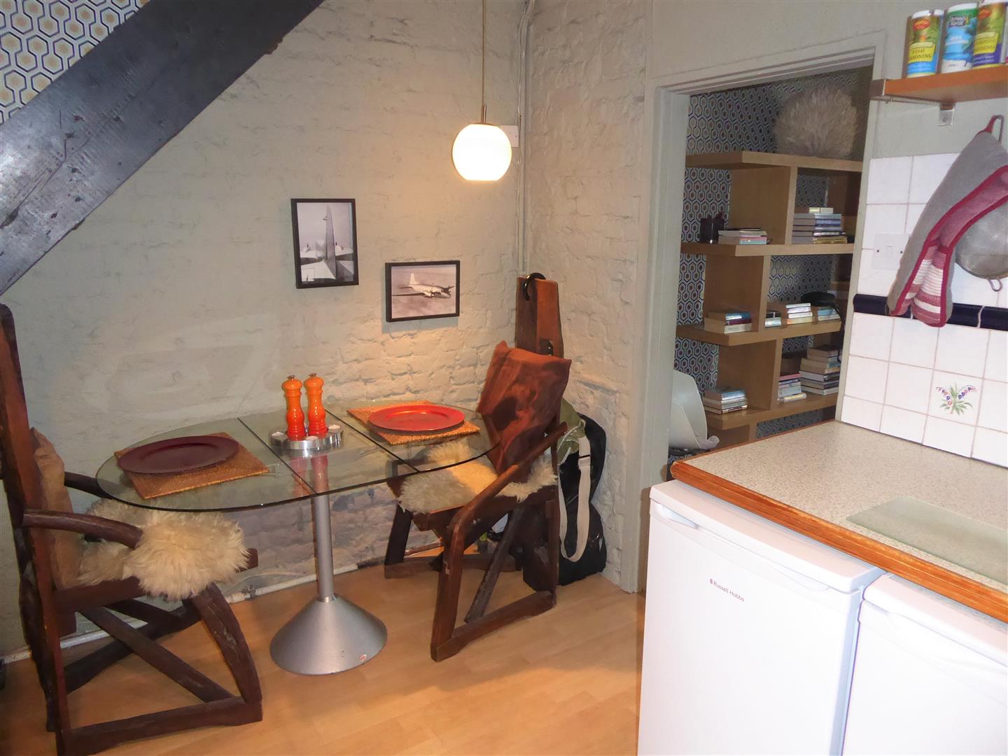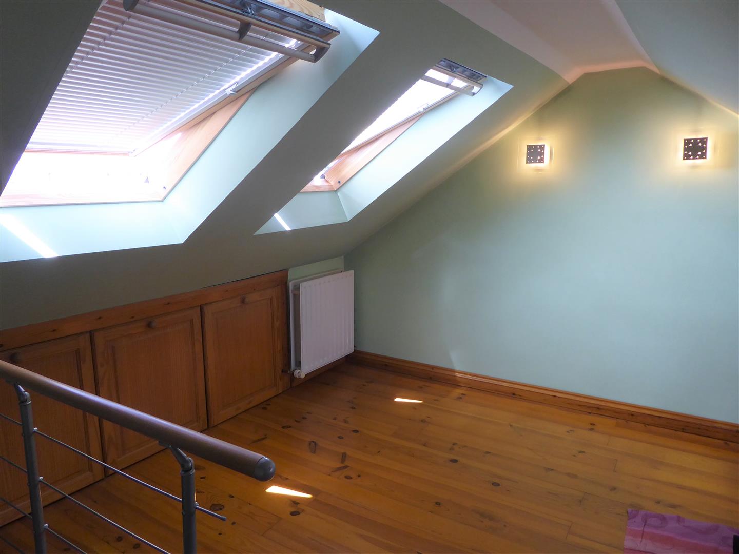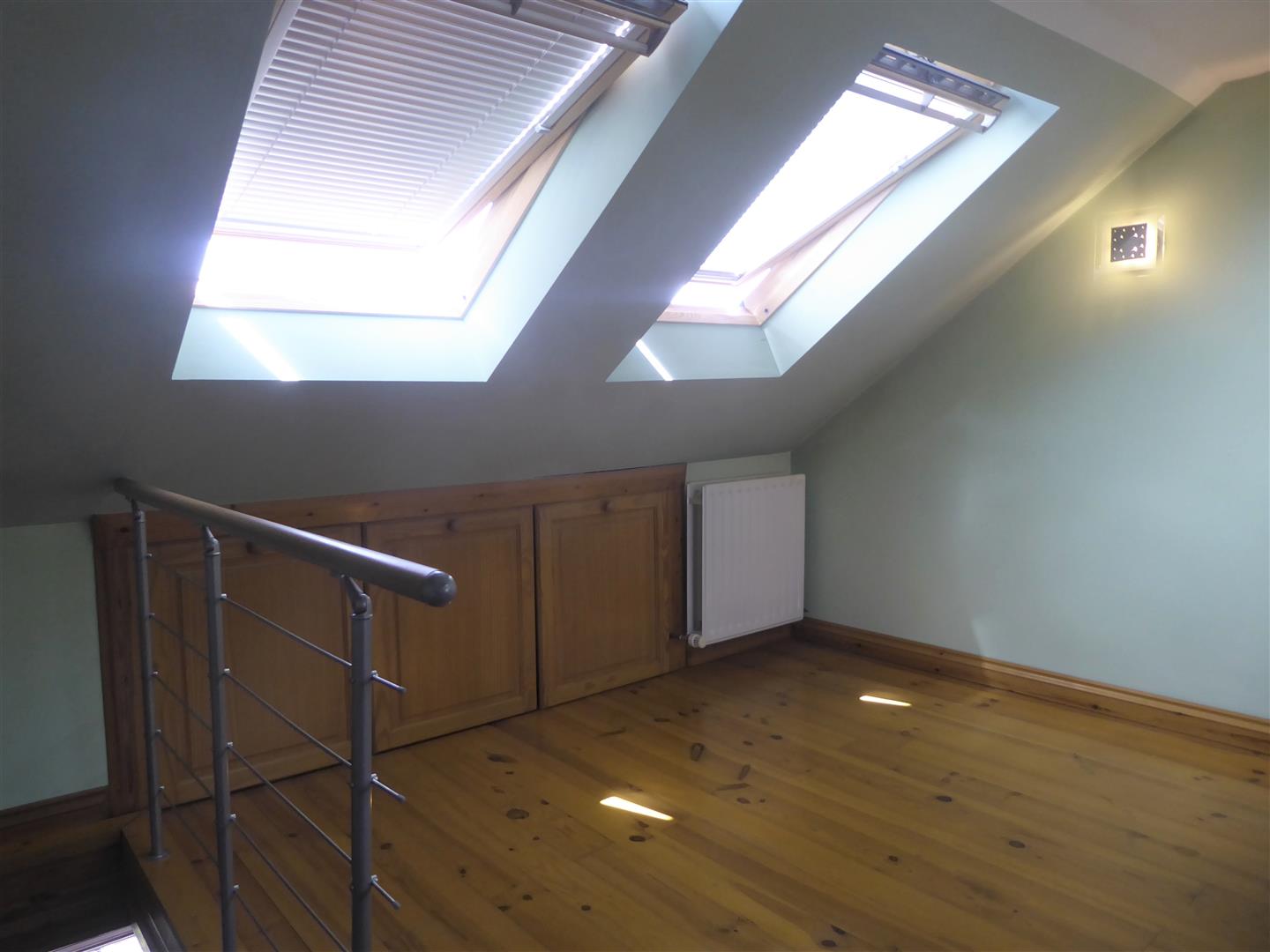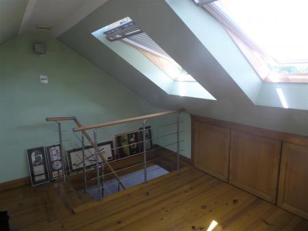 Loft Room/Study - "Velux" window, radiator, wood flooring, wall mounted lights, eaves storage.