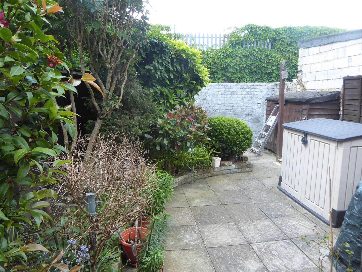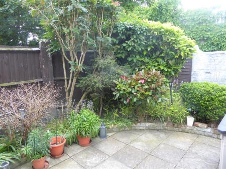 Rear Garden - Paved patio area with mature shrubs and bushes.