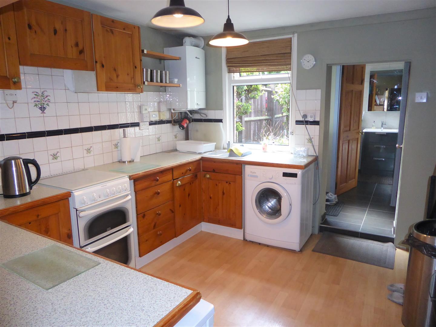Kitchen/Breakfast Room - 1 1/2 bowl single drainer sink unit with mixer tap and cupboard below, further wall and floor mounted units, space for cooker, washing machine and fridge/freezer, part tiled walls, power point, wall mounted "Worcester" boiler, rear aspect double glazed window, stairs to first floor, through to...
