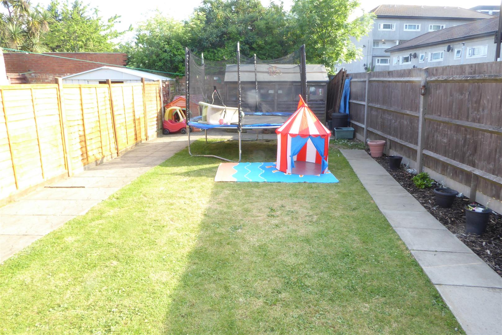 Rear Garden - Paved patio area, rest laid to lawn area, timber shed.