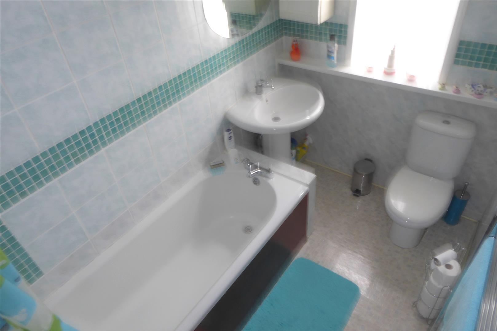 Bathroom - White suite comprising panel enclosed bath with wall mounted shower unit, low level w.c, wash hand basin, tiled walls, rear aspect double glazed window.