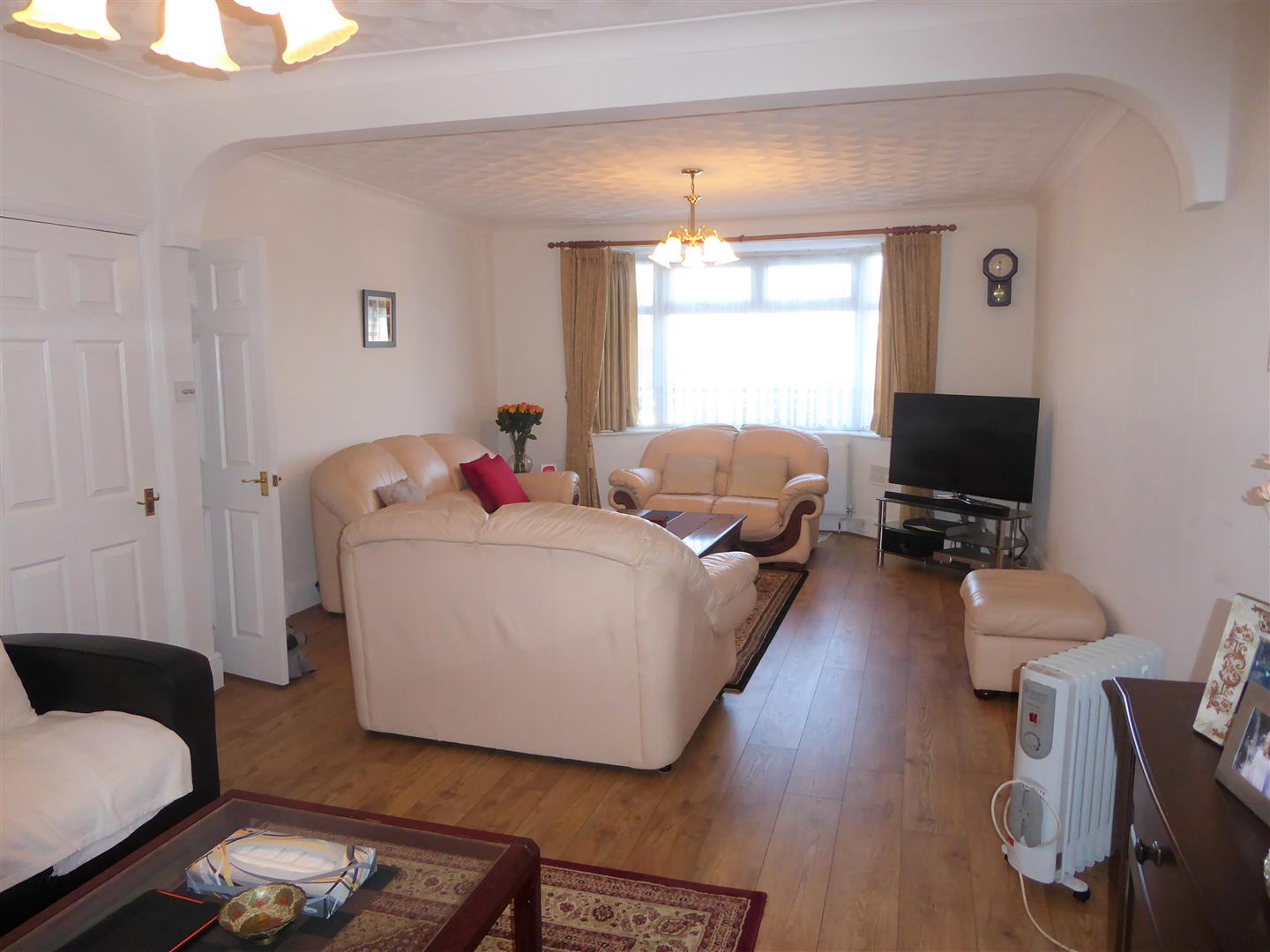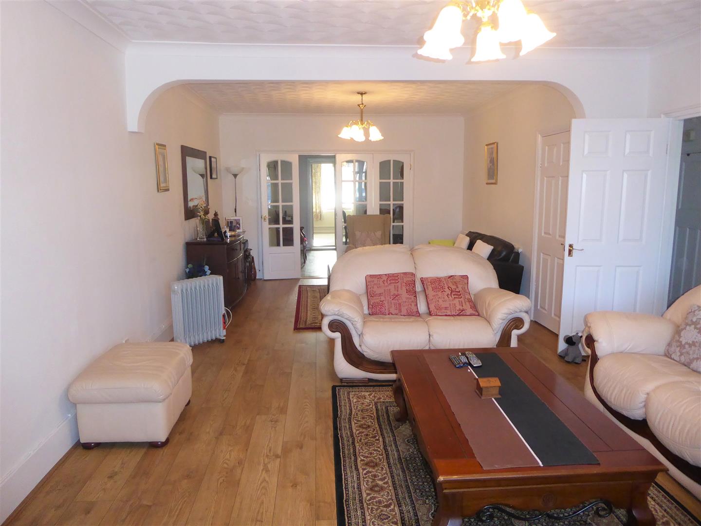 Through Lounge - Front aspect double glazed window, radiator, laminate flooring, power point, further radiator, double opening doors to...