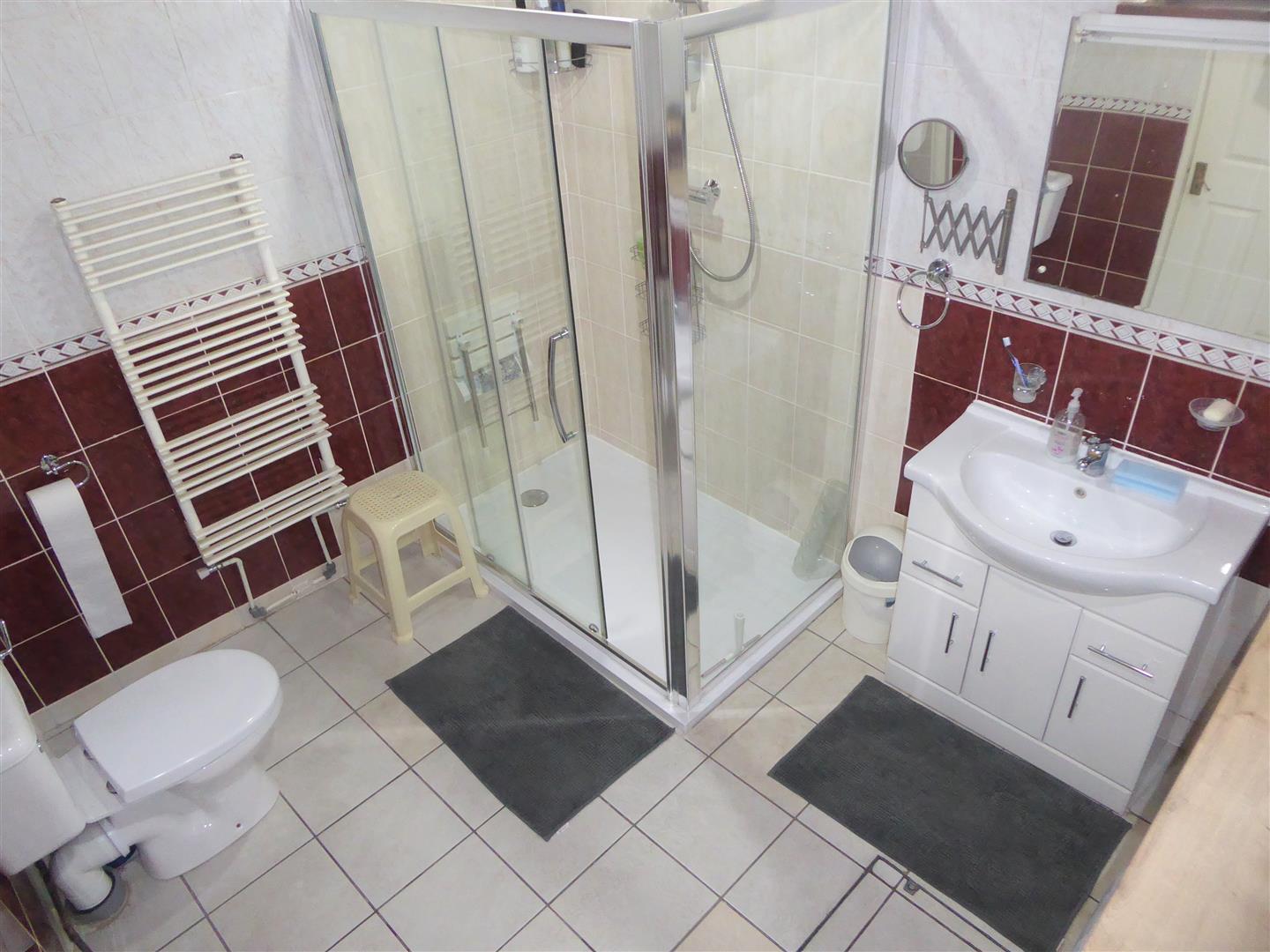 Shower Room - Tiled enclosed double shower cubicle with wall mounted shower unit, wash hand basin with vanity unit below, low level w/c, tiled walls and flooring, space for wall mounted heated towel rail.